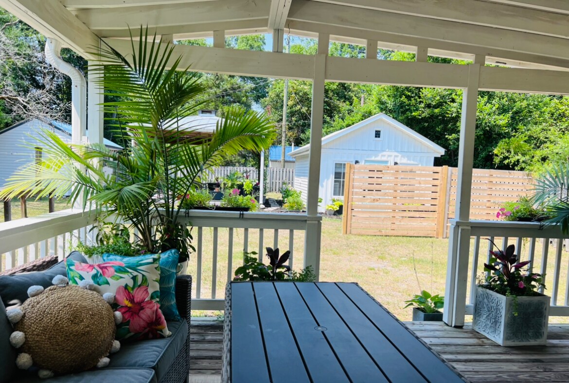Perfect location! Home is conveniently located midway between Wrightsville Beach and downtown Wilmington with extremely easy access to both. Open floorplan with two bedrooms and two full baths with a third bedroom converted into an office space. Home has two dedicated parking spots and a private fenced in back yard. Enjoy a beverage in the screened in back patio before heading out for the evening. Amenities include three TV's, washer, dryer, coffee, pressure cooker, air fryer etc.