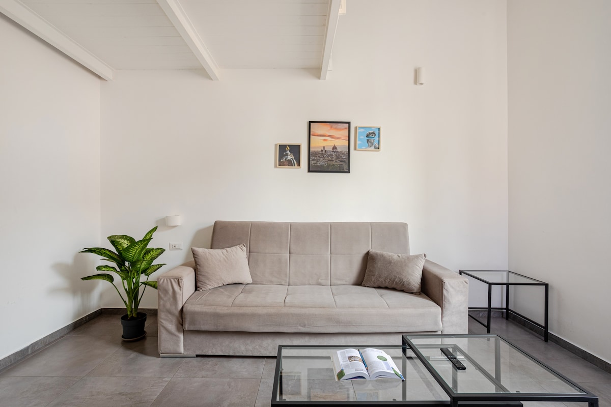 This intimate and discreet studio is located on the top floor of a building in the historic city center, just steps from the main tourist attractions. It features a living area and a sleeping area separated by a mezzanine. The studio has a private bathroom but no kitchen. The bright space offers a privileged view of the Duomo and Palazzo Vecchio, while its romantic and cozy atmosphere makes it perfect for a romantic getaway.
