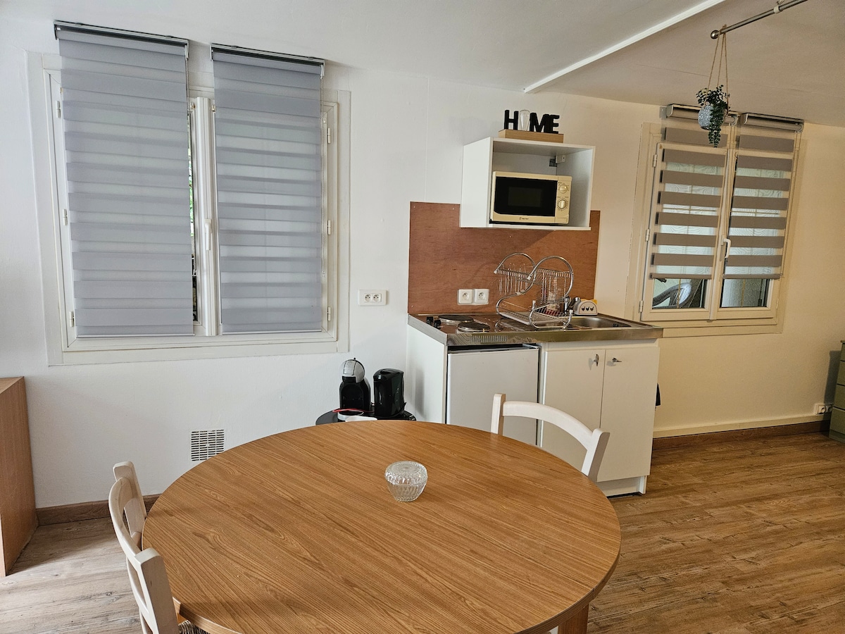 Venga a descansar fresco en el campo en un entorno tranquilo para disfrutar de la naturaleza. El apartamento tiene 40 m². Una gran habitación de 30 m² con zona de dormitorio, zona de estar y cocina americana. Cuarto de baño con ducha e inodoro. Entrada independiente y aparcamiento fácil y gratuito delante de nuestra casa. No puedo registrar la dirección en el sitio, así que aquí está: 15 allée des Camélias a las de Belle frente al consultorio veterinario, no muy lejos de la iglesia
