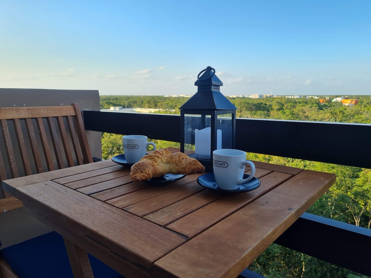 Si buscas un espacio tranquilo y seguro para descansar en Playa del Carmen, este lugar es para ti. Ubicado a sólo diez minutos en auto de las principales atracciones de la ciudad: la playa, la Quinta Avenida, del ferry a Cozumel, nuestro alojamiento es ideal para descansar cerca de las atracciones, pero lejos del tráfico y las multitudes. La Quinta Avenida y la playa están a 3.5 km aproximadamente En el balcón tenemos una mesa con sillas para que tomes un café mientras disfrutas el paisaje