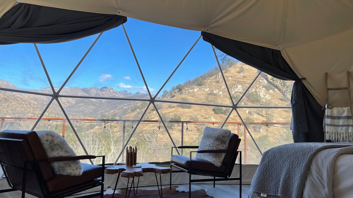 ¡Glamp con estilo a solo 15 minutos de Kings Canyon y Sequoia! Nuestras acogedoras cúpulas geodésicas se encuentran en 40 acres e incluyen aire acondicionado, WiFi, un televisor inteligente y una enorme ventana con una hermosa vista. Disfruta de una terraza privada al aire libre, acceso a un moderno baño privado (a 100 pies de distancia) y una cocina comunitaria al aire libre con parrilla. Dome ofrece vistas panorámicas del valle y las montañas. Tranquilo, único y perfecto para parejas o aventureros solitarios.