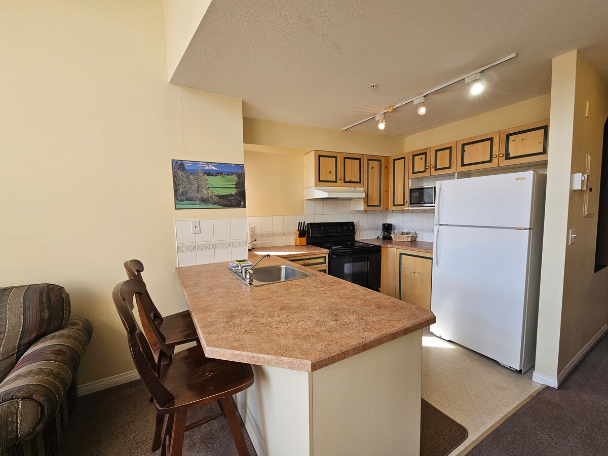 Este condominio te hará sentir en casa mientras estás de vacaciones. ¡La cocina cuenta con todo lo que necesitas para una comida deliciosa, con una nevera y estufa de tamaño completo, además de todos tus platos y utensilios! Este espacio cuenta con accesorios únicos, como un comedor de pared incorporado, paredes de tono gris y una chimenea en la habitación. Este espacio ofrece un ambiente moderno pero elegante. El hermoso patio cuenta con una barbacoa y una mesa de comedor para 2 personas. Disfruta de una copa de vino de Okanagan o cerveza artesanal mientras estás sentado en el gran patio al aire libre.