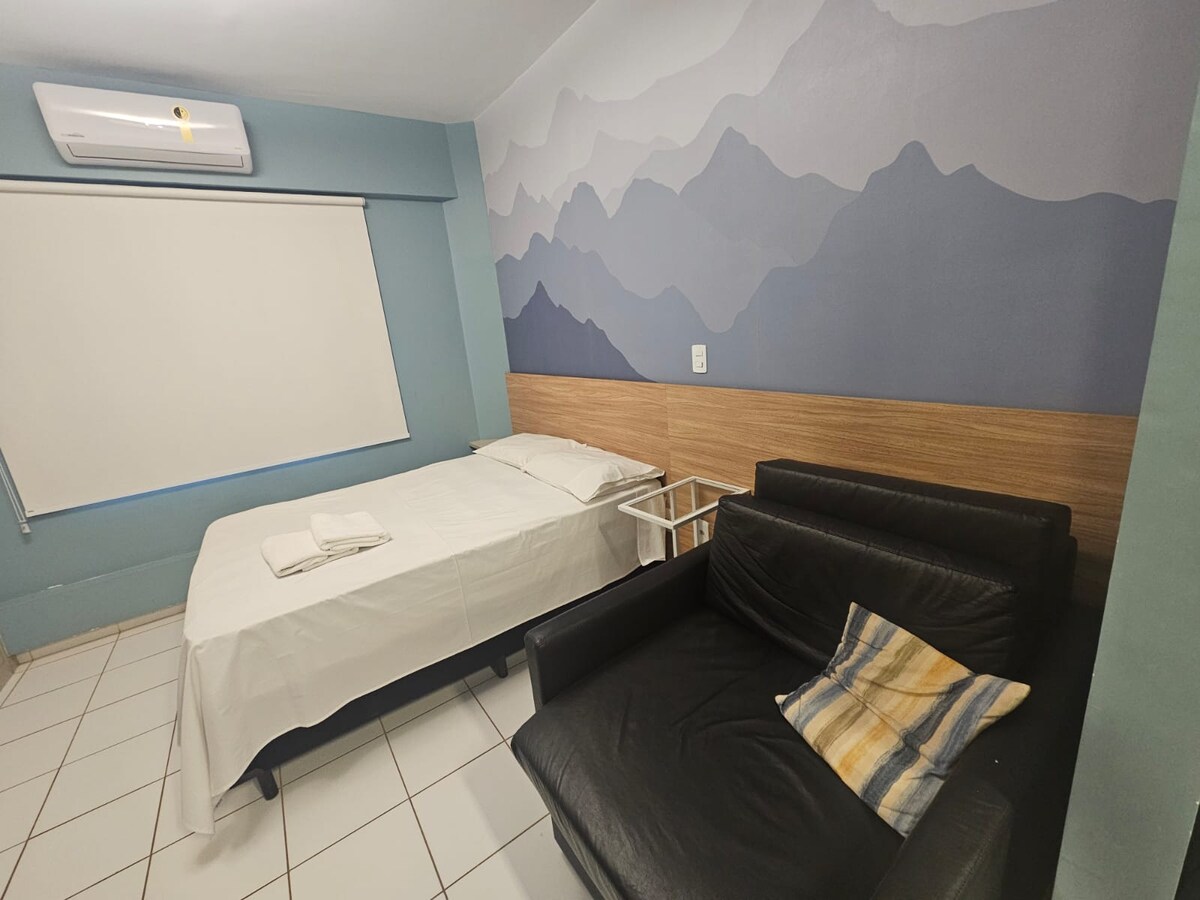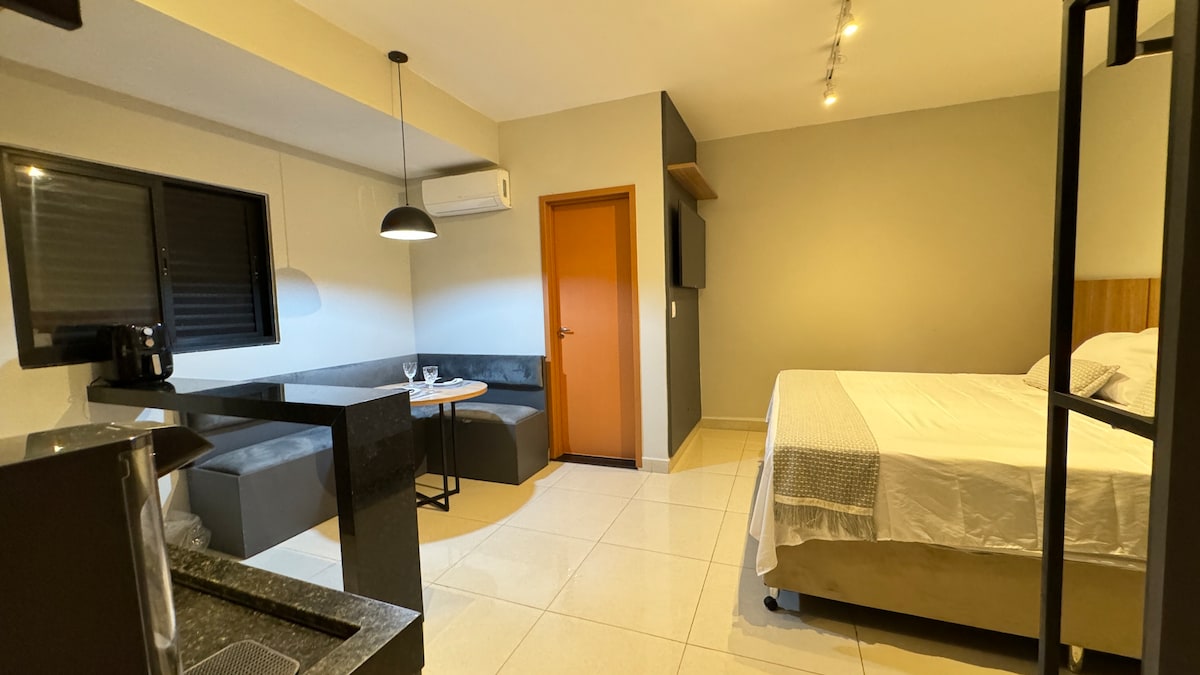 Este exclusivo espacio está estratégicamente bien ubicado, lo que permite un fácil acceso a todos los puntos esenciales de Campo Grande. Totalmente equipado con TV, microondas, horno eléctrico, encimera, minibar, aire acondicionado y una cómoda cama tamaño queen, que proporciona el descanso ideal. Además, una encantadora cafetería integrada en el edificio tendrá a tu disposición. Con una ubicación privilegiada, disfruta de la elegancia y la comodidad en nuestro apartamento situado en el corazón de la ciudad.