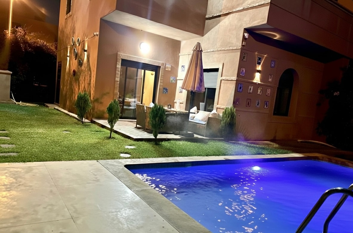 Villa Riad Perle d'Annellia, con piscina privada, se encuentra a unos 7,5 km de Marrakech. Ofrece 3 piscinas, una terraza, wifi y aparcamiento privado, dentro de una residencia segura. La villa está totalmente climatizada e incluye 2 suites con baño privado, 2 salones y 1 cocina equipada. Se proporcionan toallas y ropa de cama. Los huéspedes pueden disfrutar de 2 piscinas compartidas, 1 zona infantil, tiendas y restaurantes cercanos y un servicio de conserjería.