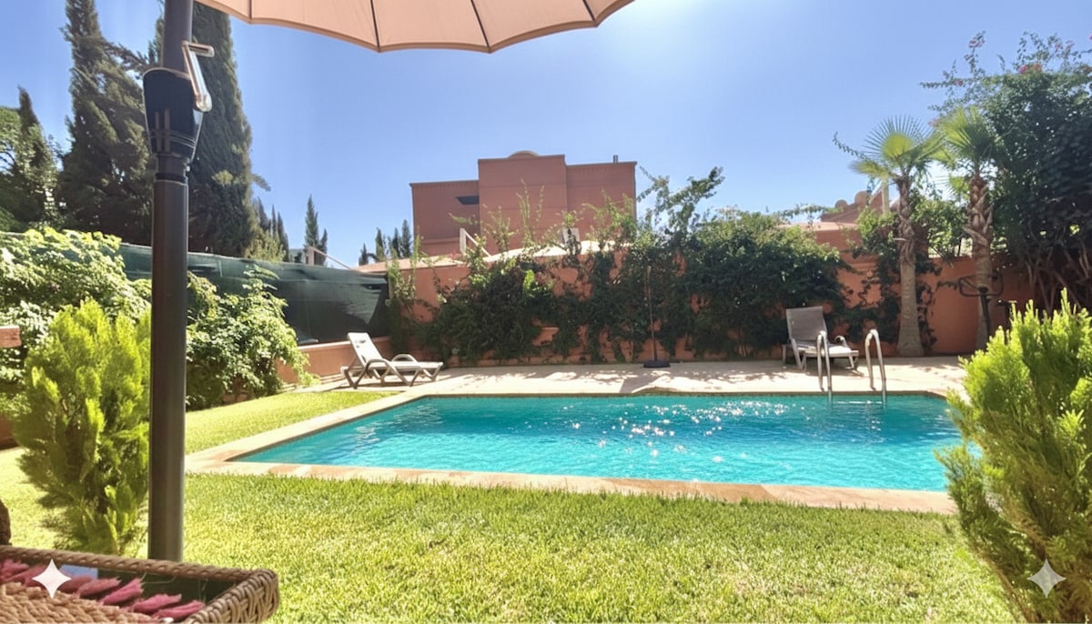 Villa SOLO para FAMILIAS y PAREJAS. Nuestra villa se encuentra a 30 minutos del centro y del aeropuerto en una residencia peatonal tranquila y segura. La villa amueblada está decorada con cuidado y totalmente climatizada, se encuentra en una gran parcela cerrada, arbolada y sin vecinos. Tiene una terraza en la azotea con vistas al Atlas, una terraza equipada en la planta baja con piscina privada de 8 m x 4 m CLIMATIZADA por un suplemento de 40 €/día del 15 de noviembre al 15 de marzo. Se ofrece servicio de limpieza y/o cocinero por un cargo adicional.