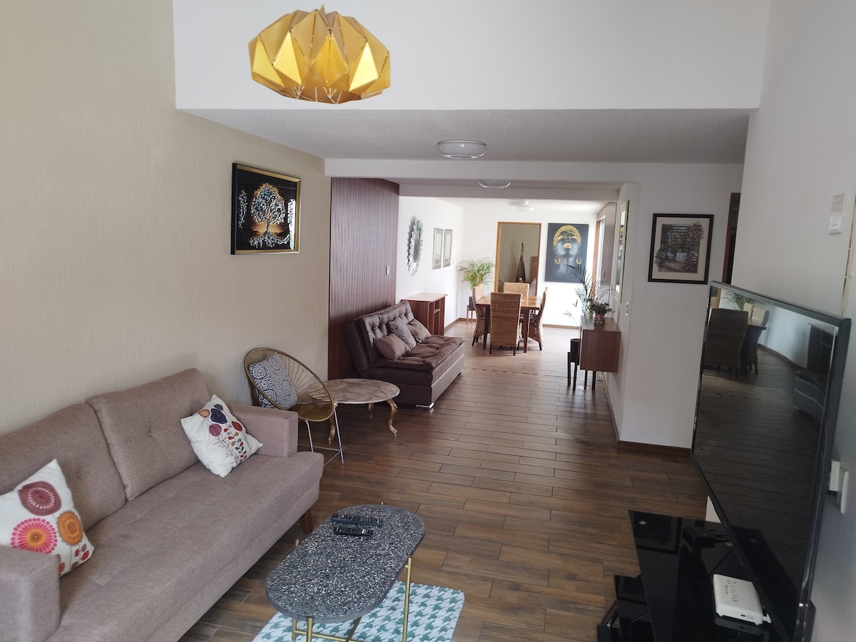 Alojamiento hasta para 8 personas. A 2 minutos del cine, gimnasio y supermercado, 5 minutos del planetario y del zoológico, y 10 del centro histórico. Tres habitaciones. 4 camas y 1 sofacama. 2 baños completos. Cocina integral equipada, Patio, Terraza con área de Asador y Fogatero. Wifi. Tv y netflix en cada habitacion. Tambien es posible rentar por Habitación, dependiendo de sus necesidades de hospedaje.
