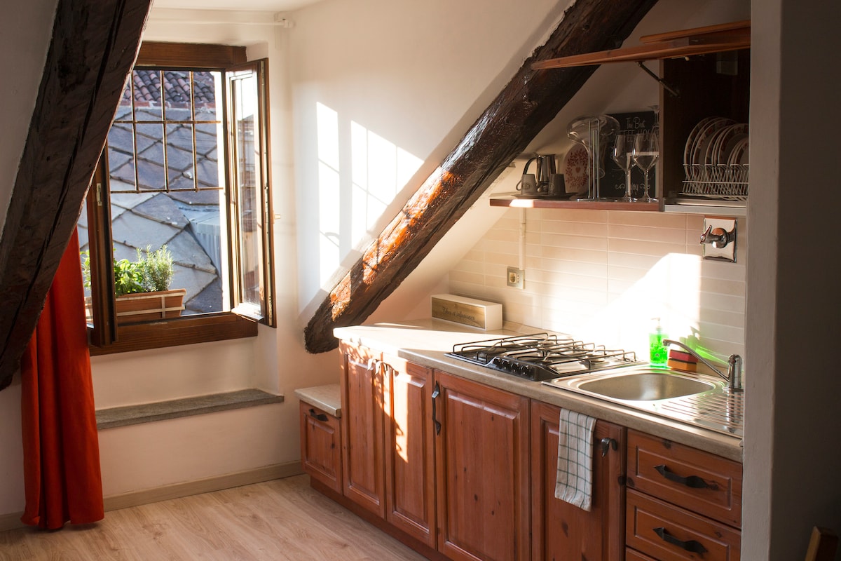 El apartamento está ubicado en un edificio del siglo XVIII (en el antiguo barrio romano, el corazón más antiguo de la ciudad) y te permite visitar la ciudad a pie. Es un gran estudio ático (40 metros cuadrados), con una cama doble (160x200), un sofá cama convertible en cama individual o doble (160x200), una pared de cocina equipada y un baño grande y luminoso también equipado con lavadora/secadora. También: ascensor, puerta de seguridad y calefacción programable.
