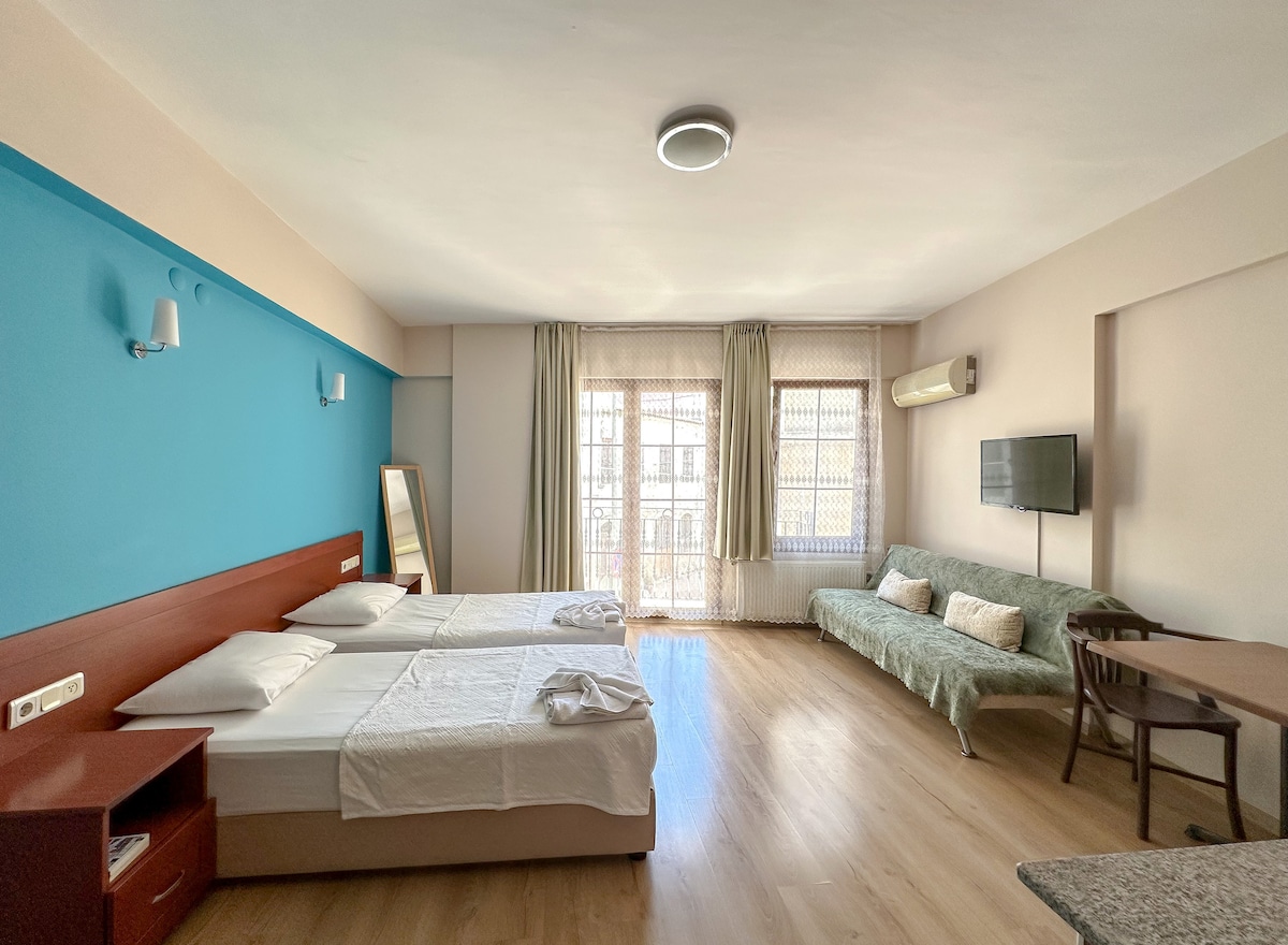 Estamos seguros de que tendrá buenos recuerdos en nuestra suite 1+1. Porque nuestro hotel boutique, que conserva su textura histórica, es extremadamente romántico, tranquilo y agradable con su ubicación y vista. Nuestro hotel es muy atractivo porque tiene un mar limpio justo enfrente de nuestro hotel, está al lado de lugares de entretenimiento populares y está muy cerca de centros comerciales.