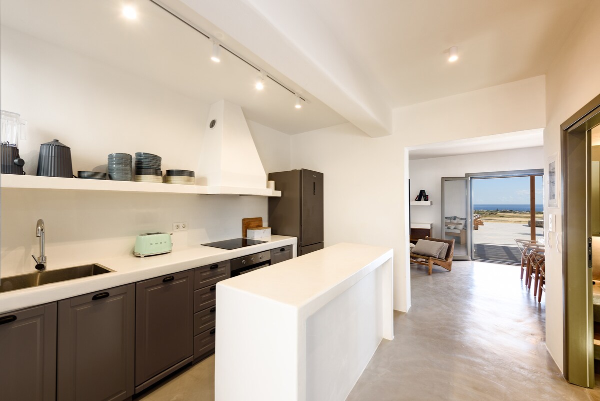 Villa Arismari se encuentra en una ladera serena, rodeada de rocas naturales, con vistas a la hermosa costa de Orkos. Tenemos una impresionante vista panorámica al mar Egeo y a nuestra isla vecina de Paros. Estamos situados entre la playa principal y las bahías más pequeñas de Orkos. Mientras disfrutas de las vistas que ofrece Villa Arismari, prepárate para hacerte unos selfies increíbles. Villa Arismari es una villa de diseño minimalista cicládico.