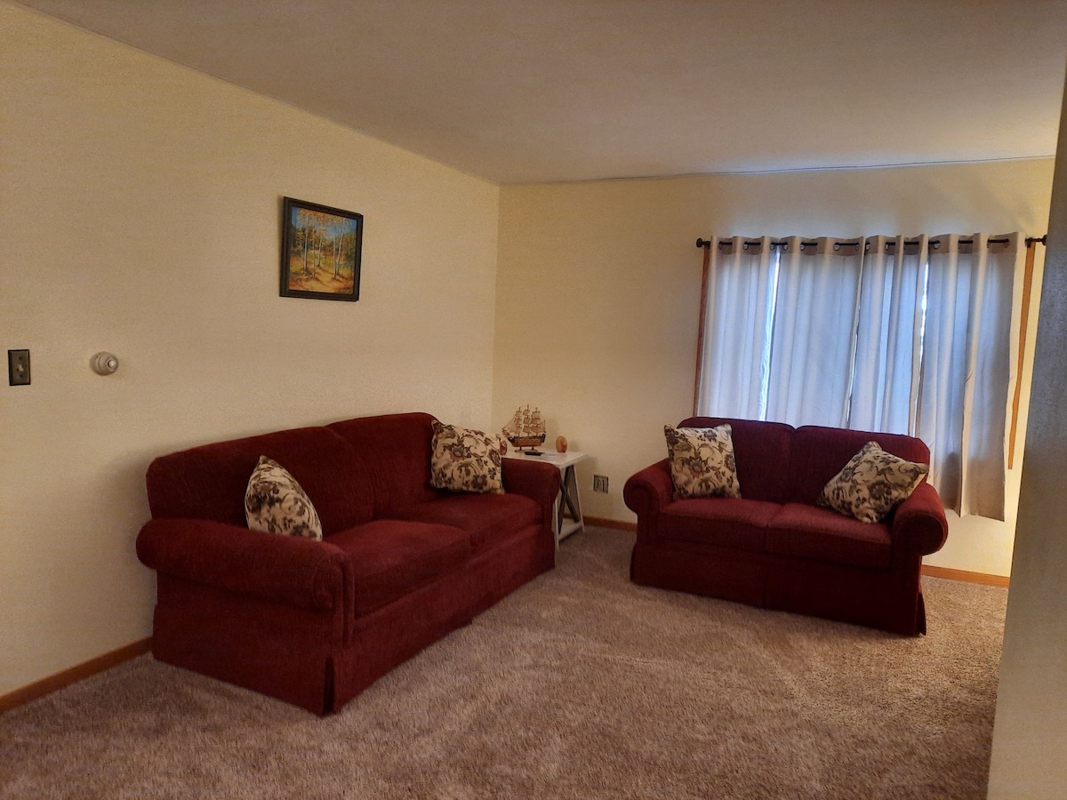 Relájate con toda la familia en este alojamiento tranquilo. Dos dormitorios, una cama tamaño queen y otra cama completa. La sala de estar tiene dos sofás cama. Son camas de tamaño completo y tamaño queen. Recientemente hemos añadido una cama plegable (tamaño individual) que puede alojar hasta 5-9 personas si no te importa compartir cama. No se permite fumar ni tener mascotas en el interior. ¡Hermosa vista!