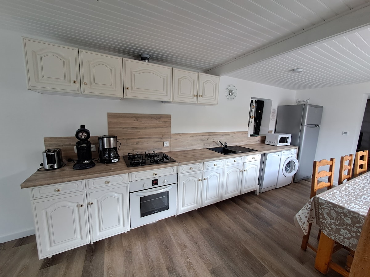 Descripción: Sala de estar ( sofá , televisión ) Cocina abierta totalmente equipada (lavavajillas, nevera, microondas/parrilla, cafetera Senseo, batería de cocina) 1 habitación con cama para 2 personas ( ropa de cama con suplemento) y televisión Cuarto de baño con ducha de azulejos e inodoro ( toallas por un suplemento) Terraza equipada con muebles de jardín, barbacoa de carbón Despensa Zona verde privada