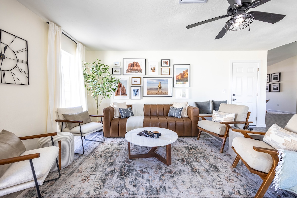 Escondido en un barrio tranquilo se encuentra un refugio moderno de mediados de siglo, con una reluciente piscina nueva y un jacuzzi caliente, todo ello en un patio trasero aislado que incluso los cactus locales envidian. Entra en un interior diseñado por profesionales que parece sacado de una revista de diseño. Deja que tus habilidades culinarias brillen en nuestra cocina totalmente equipada. Recién renovado de arriba abajo, complementado con una barbacoa al aire libre y un comedor perfecto para esos mágicos festines al atardecer. Este alojamiento es para todos.