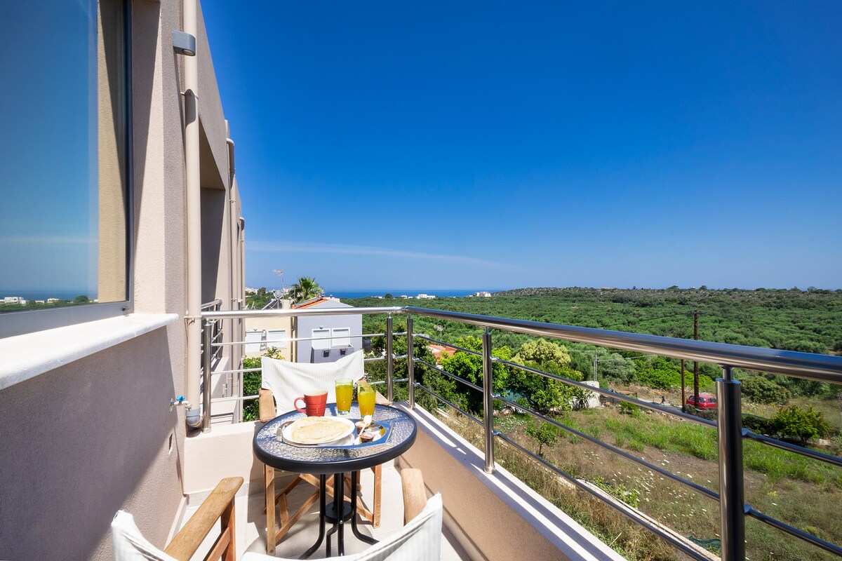 Vista al mar cretense desde el gran balcón privado o al jardín desde su gran terraza. En la primera zona se encuentra la sala de estar con un cómodo sofá y 2 sillones anatómicos que en total se convierten en 4 camas individuales. La segunda habitación es el dormitorio principal. Amplia cocina italiana Stosa totalmente equipada. En el apartamento hay ventilador de techo, aire acondicionado, televisores vía satélite en cada habitación. ¡Nuestro baño totalmente renovado en tonos mínimos, combinado con la columna de hidromasaje, te ofrece el lujo que te mereces en tus vacaciones!