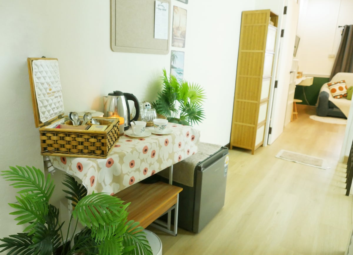 Un lugar tranquilo al que puedes llegar directamente desde el aeropuerto de Suvarnabhumi y con fácil acceso al centro de la ciudad. FÁCIL ACCESO: a 7 minutos a pie del tren elevado (estación de enlace del aeropuerto Ramkhamhaeng) con el que puedes conectar con cualquier lugar de Bangkok en BTS y MRT. A 20-30 minutos en coche del aeropuerto de Suvarnabhumi. Es fácil conseguir autobuses, taxis y bicicletas. CÓMODO: tienda 7/11 y una cafetería en el edificio, algo de comida callejera local cerca. ¡Servicio de lavandería gratuito! (lavado, secado y pliegue) SEGURIDAD: servicios de seguridad las 24 horas y CCTV.