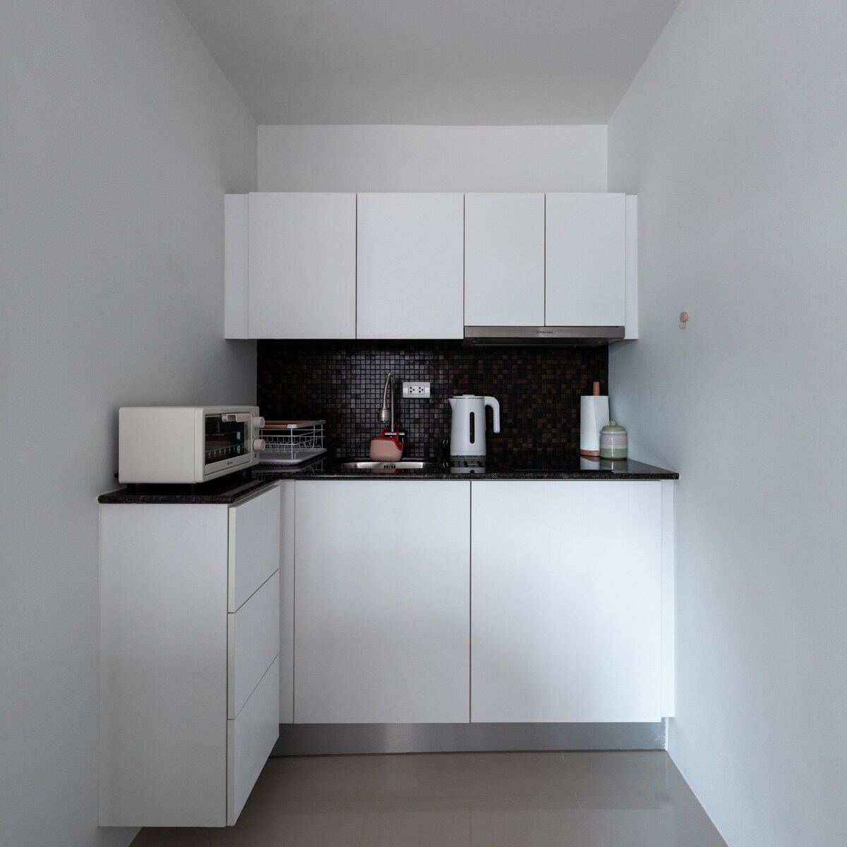 A bright corner studio with a wrap-around balcony offering panoramic views and perfect remote work setup. Modern interior features a large bed, AC, TV, washer-dryer and internet. The rooftop infinity pool and 5th floor terrace provide stunning views of the Thai Gulf and surroundings. Everything you need is within walking distance: Mae Phim beach, restaurants, cafes, 7-Eleven, scooter rental, and pharmacy. Special rates for extended stays for digital nomads.