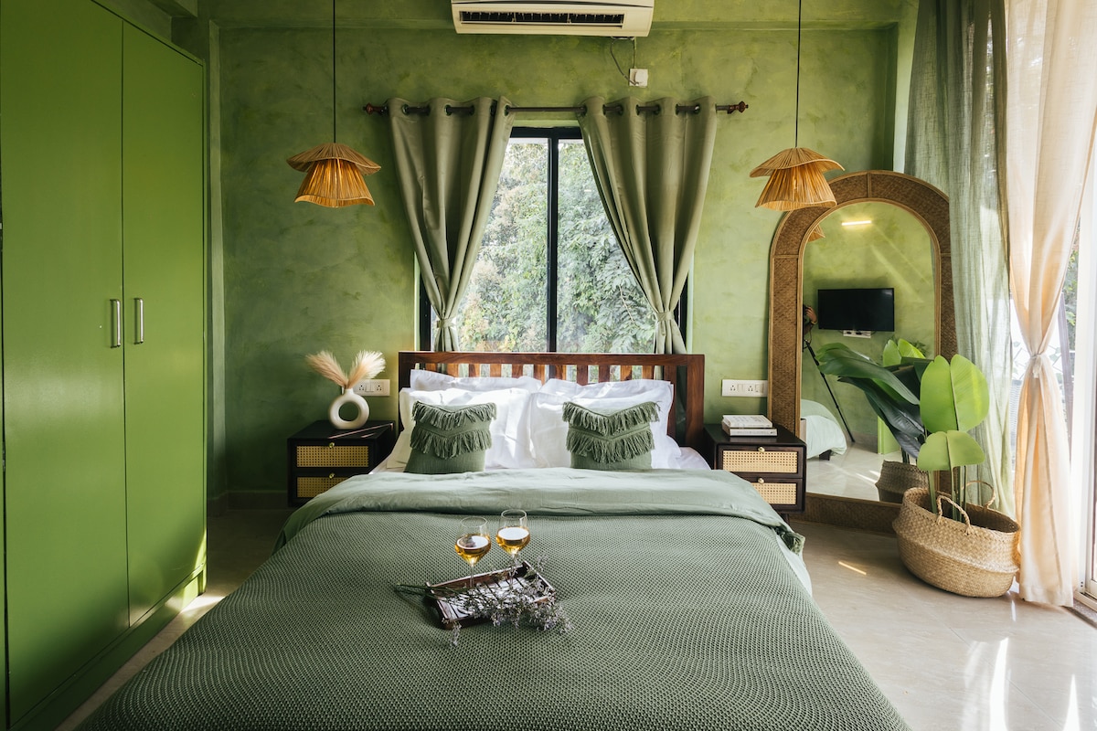 Tropical 3BHK Home | Lush Green Surroundings Relax in this beautifully designed 3BHK apartment in Goa with calming green interiors and a warm tropical vibe. The home features three spacious bedrooms, air-conditioning, stylish lighting and large windows with ample natural light. Enjoy your private balcony with partial sea view, overlooking lush greenery and the iconic Chapora Fort. Perfect for peaceful mornings. Ideal for families, friends and long stays in North Goa.