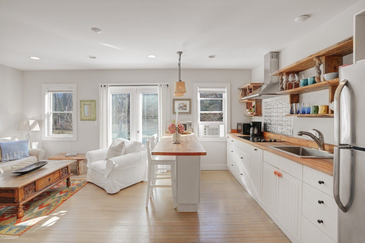 Nuestro soleado estudio está situado en el centro de Martha's Vineyard. Una ubicación en la parte baja de la isla con una sensación de la parte alta. Estudio abierto y espacioso con cocina americana y baño. El apartamento cuenta con todos los elementos esenciales. El apartamento se encuentra a poca distancia a pie de rutas de senderismo y ciclismo. A 10-15 minutos en coche de cualquier ciudad/playa de la isla. ***Ruego que tenga en cuenta: aunque estamos convenientemente ubicados, no estamos a poca distancia a pie de bares o restaurantes. Recomendamos a los visitantes que vengan por primera vez que alquilen o traigan un coche.