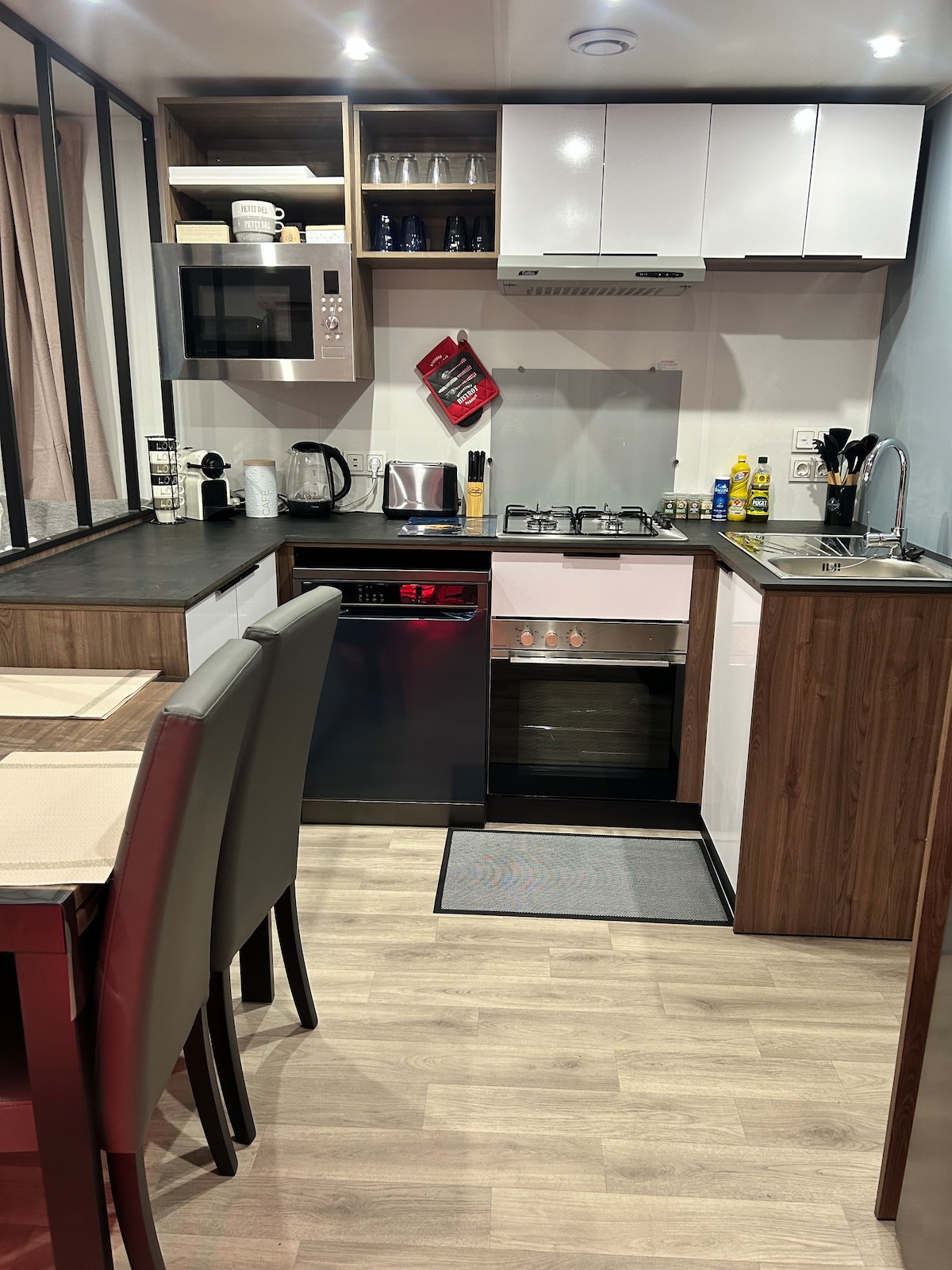 Este alojamiento tranquilo ofrece una estancia relajante para toda la familia. La casa móvil consta de una gran terraza cerrada con cocina equipada y nevera (compartimento congelador). También tiene 3 dormitorios, incluyendo una suite principal con acceso directo al cuarto de baño. Cocina en el interior con horno, y una segunda nevera/congelador grande. WC separado. Le recomendamos encarecidamente que utilice las duchas comunes del camping, más amplias y más prácticas, especialmente después de la playa.