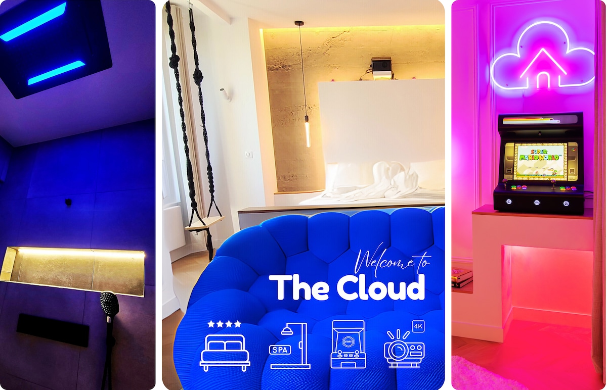 The Cloud ☁️ Suite de luxe au cœur de Troyes ! Offrez-vous une nuit hors du temps dans une bulle de confort, de design et de sensations. 💎 Lit King Size 5* pour flotter comme Sangoku sur son stratus 🚿 Douche sensorielle en Duo 🕹️ Borne d’arcade avec 8000 jeux 🎬 Cinéma 4K immersif - même en journée ! 🌳 Balançoire suspendue vue sur les arbres 🛋️ Canapé nuage sublimé par une aurore boréale LED 🧳 Réservez votre escapade céleste – et laissez-vous porter par les nuages