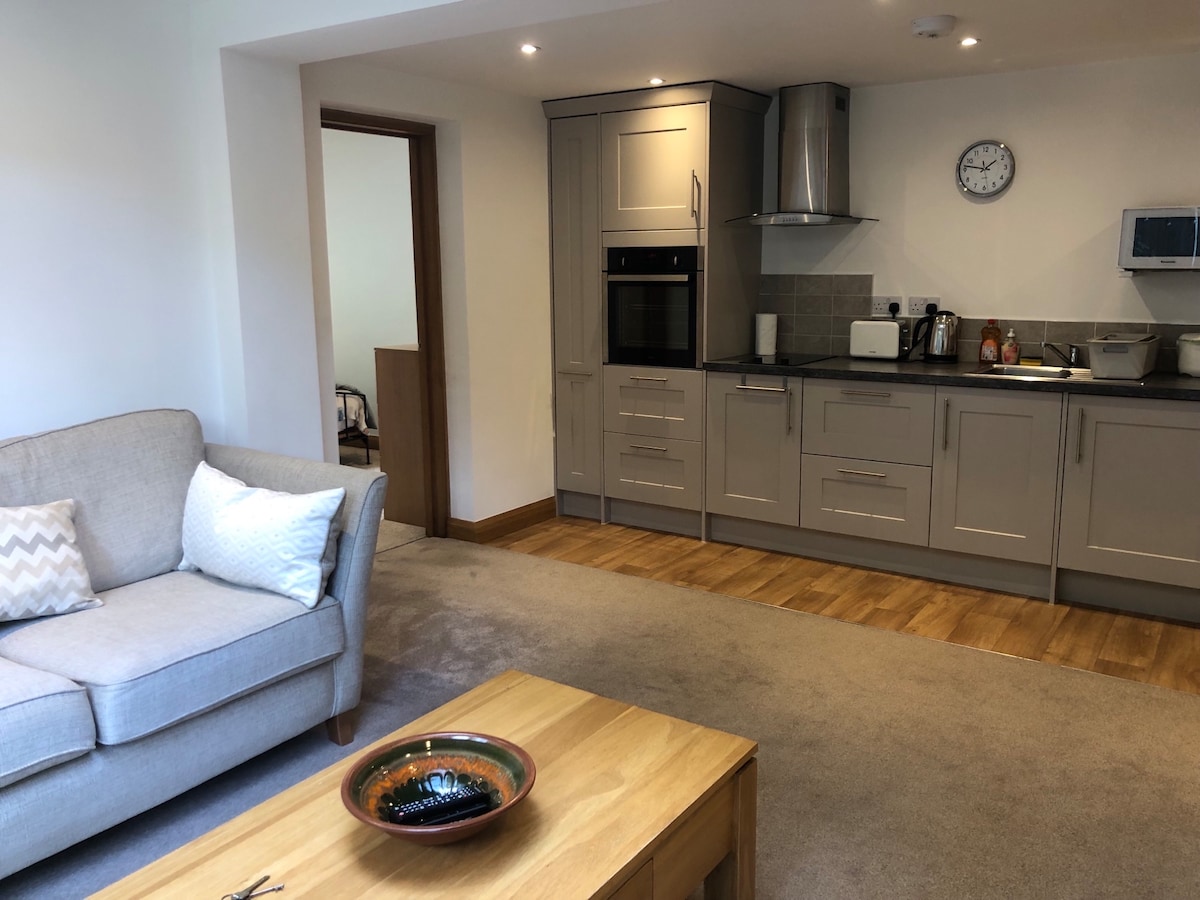 Nuestro apartamento en la primera planta ofrece una habitación con dos camas individuales con baño con ducha, cocina, internet, TV y calefacción por suelo radiante. Aspecto soleado con ventanas a ambos lados. Vistas al jardín y al campo. La casa está situada a unos 100 metros de la carretera y, por lo tanto, es tranquila. Tiene mucho aparcamiento fuera de la carretera y una parada de autobús en el exterior. A menos de 400 yardas tenemos un pub, restaurantes chinos e indios, cafeterías y quioscos. El supermercado más cercano está a una milla de distancia.