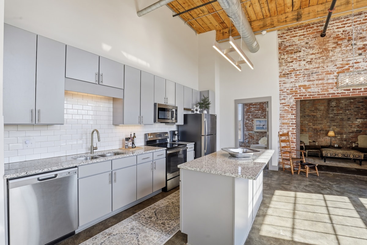 Top floor historic loft at Converse Mill with breathtaking River Views. This spacious two bedroom, two bath unit features soaring ceilings, original brick and wood beams, and oversized windows filled with natural light. Both bedrooms offer king beds and walk in closets, plus a sofa bed for extra guests. Enjoy a full kitchen with island, elevator access, pool, gym, and prime location near I-85, Spartanburg, and Cowpens. Sleeps 6 comfortably.
