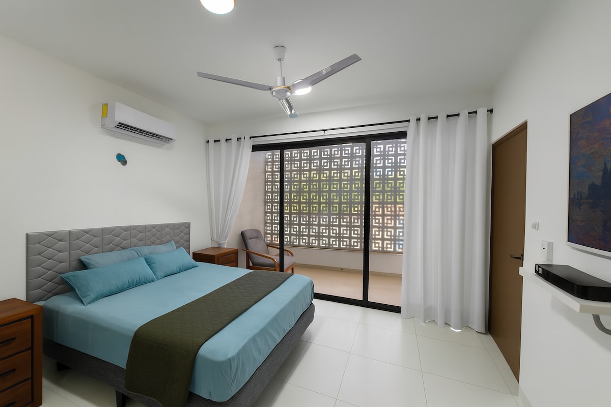 Desconecta de tus preocupaciones en este espacio tan amplio y sereno. Disfruta de 2 habitaciones grandes y acogedoras. Descansa en colchones de gama amplia y relájate viendo tus series favoritas en las smart tv o de la programación de 200 canales. Desde la comodidad de tu cama, enciende o apaga la luz, ventilador, aire acondicionado y pantalla. Encontrarás un vestidor amplio, cocina, comedor, salita, terraza, sofá cama, plancha, burrito para planchar, ganchos, secador(cabello), juegos de mesa.