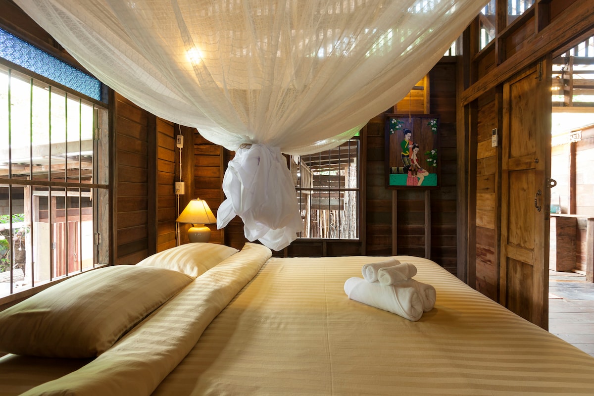 Nuestra encantadora casa es semi-de madera con 3 dormitorios con aire acondicionado y 3 baños. Está equipada con cocina, bar, wifi de fibra óptica y un gran espacio abierto en la planta superior. Es perfecta para una familia con niños o un grupo de amigos. Estamos a 10 minutos a pie de la Puerta de Chiang Mai y de la calle peatonal del sábado. Ofrecemos desayuno casero gratuito todas las mañanas y servicio de recogida gratuito desde el aeropuerto.