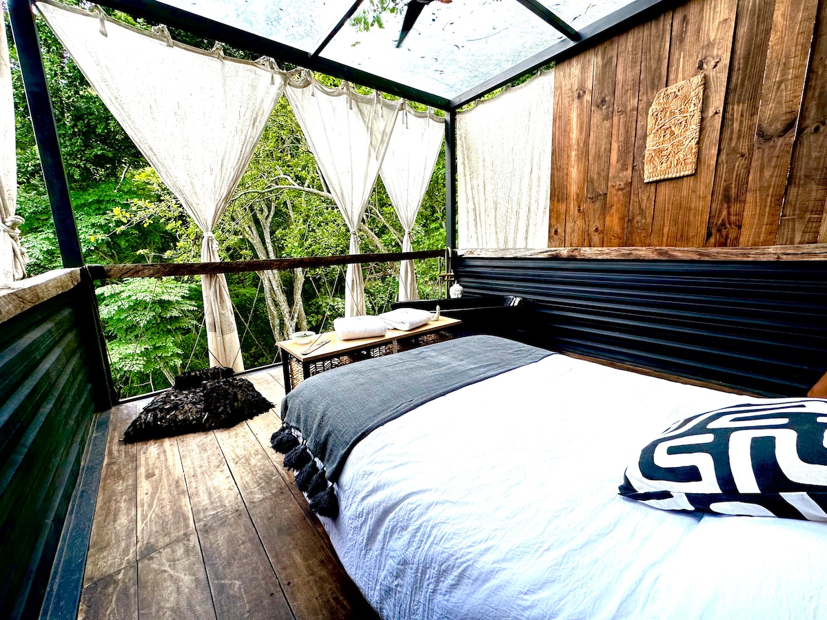 Esta es una Tiny house muy acogedora, con todo lo necesario para cortas o largas estancia ya que esta totalmente equipada y es independiente, Su vista al pueblo, bahia y montana te dan paz y tranquilidad, su interior es tan acogedor que te sentiras que te atrapa y no querras salir, solo descansar aqui. El area total en donde se ubica son 1,600 metros de naturaleza tropical, arboles frutales y una sin fin varierad de aves. Las noches estrelladas seran las mas bonitas que hayas visto.