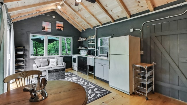 •NEW hot tub in November 2023! •Remodeled in 2021! •Unique Modern Nordic lakefront cabin! •Dog friendly w/an outdoor space second to none! •Sleeps 4 •NEW Hybrid Queen Mattress June 2023. •Enjoy stunning views of spring fed Popple Lake! •Fish & swim from the dock! •Nature awaits on this 1+ acre lot w/160 ft of private shoreline, dock, deck, firepit, & screened in gazebo! •Complimentary paddle boat, canoe, 2 kayaks, & aqua lily pad (May-Sept) •Near State Parks, museums, a zoo, trails & more!