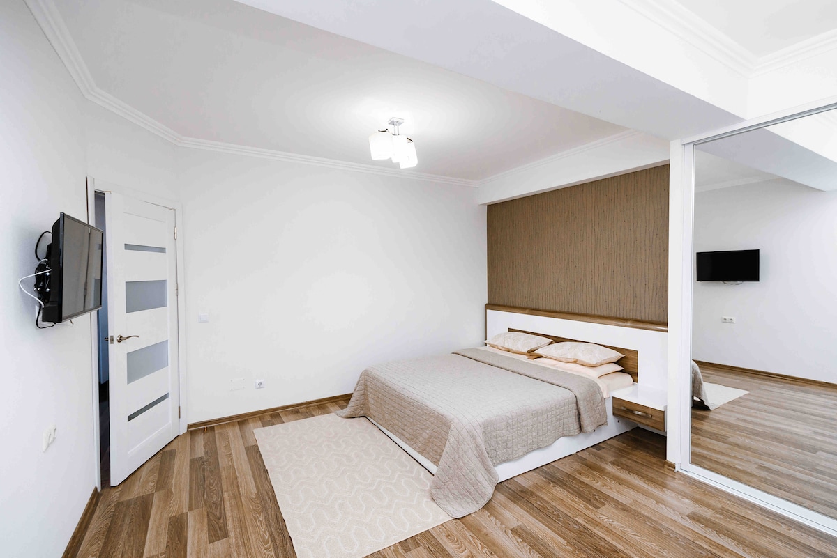 apartamentos en el centro de la ciudad. En el cuarto piso. Casa con ascensor. Hermoso diseño interior. Dormitorio separado con una cama tamaño queen y el colchón más cómodo. Cocina totalmente equipada con todos los utensilios para cocinar. Ubicación conveniente, cerca de tiendas, restaurantes, centros comerciales, un cine, un parque. Literalmente al otro lado de la carretera, a 2 minutos a pie, se encuentra el hipermercado más grande de Moldavia Nr. 1, también el restaurante Andys y Taxi Blues Centro comercial MollDova a 5 minutos a pie. Parque cercano.