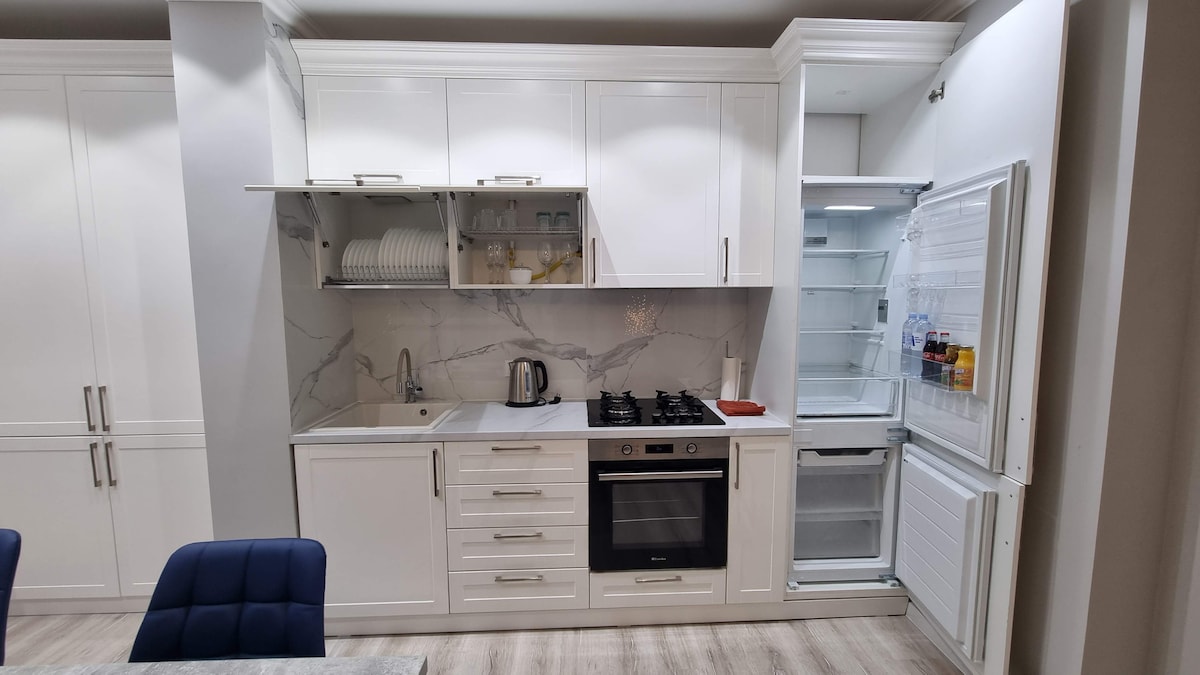Un apartamento moderno y espacioso con un diseño clásico, acogedor y siempre perfectamente limpio. Ubicado en una casa nueva con un lujoso interior clásico. Equipado con todo lo necesario para una estancia larga y cómoda: - Cubiertos, platos. - Lavadora - Secador de pelo, plancha, tabla de planchar, secadora de ropa. - Cafetera, hervidor de agua. - Microondas, horno, fogones. - Televisor grande. - Muebles cómodos y de alta calidad. - Y mucho más...