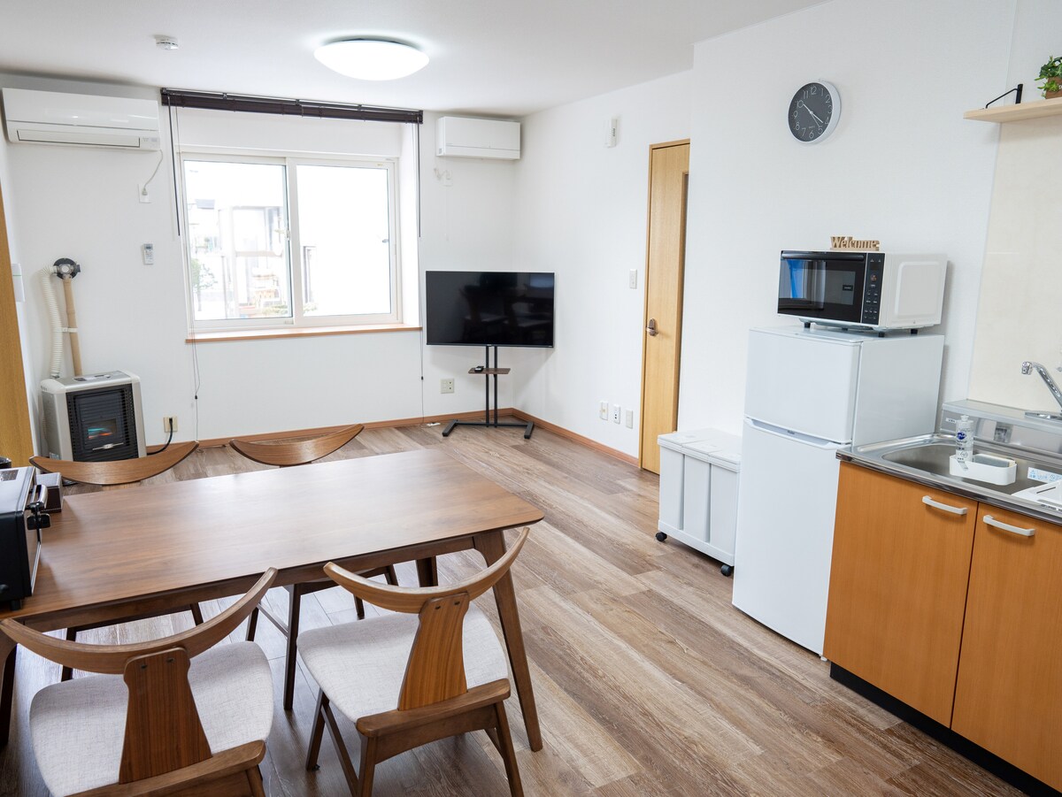 新千歳空港・札幌方面へのアクセス抜群! JR千歳駅から徒歩10分、飲食店がひしめく人気エリア「幸町(さいわいちょう)」に位置する、新築のプライベートアパートメントです。 ■ロケーション:グルメな夜を楽しむならココ! 幸町は、地元民にも愛される飲食店の宝庫です。 徒歩圏内に名店多数: 北海道名物のジンギスカン、新鮮な寿司、〆のラーメン、賑わう居酒屋などがすぐそばに!夜遅くまで北海道グルメを満喫しても、歩いて帰れる安心の立地です。 ■お部屋の魅力(最大4名様) 2025年オープンの清潔感あふれる空間です。 快適な設備: セミダブルベッド2台に加え、ソファベッドをご用意。カップルからご家族まで対応可能です。 長期滞在も安心: IHコンロ付きキッチン、調理器具、洗濯機(洗剤付き)を完備。自分の家のように快適にお過ごしいただけます。 ■周辺環境 コンビニやスーパーも近くにあり、買い出しにも困りません。 「食べて、飲んで、すぐ休める」最高の立地で、北海道の旅をスタートさせませんか?皆様のご予約をお待ちしております!
