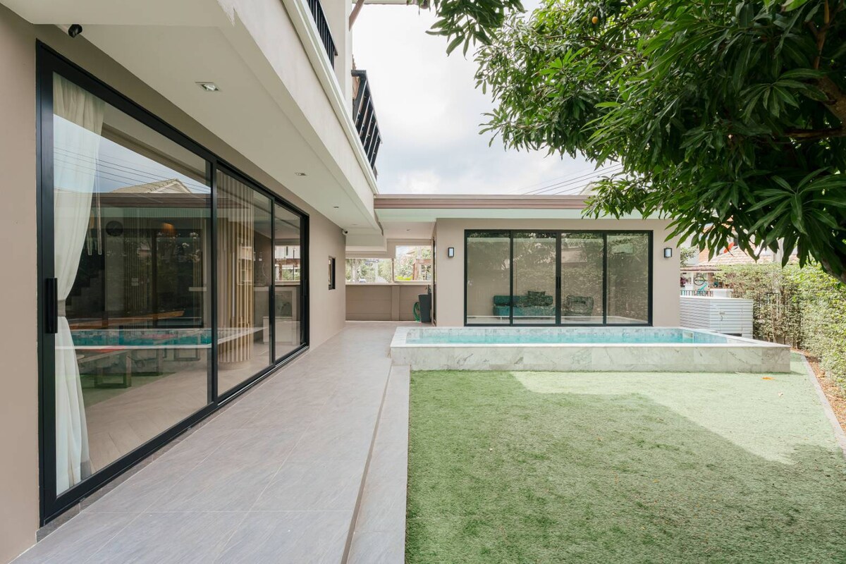 Villa 🌴🌴🌈✨con sonrisa en la piscina. Es una gran casa independiente adecuada para 8-10 personas. 🏊♀️Piscina privada. Cerca del mar, a solo 400 metros de la playa, parrilla, totalmente equipada con utensilios de cocina, casas grandes, gran relación calidad-precio, estacionamiento para varios coches. 🌺Toallas gratis 🌺Wi-Fi gratis Utensilios y platos 🌺gratuitos Bicicleta 🌺gratis Karaoke 🌺gratis 🎶🎶 Mesa 🌺gratuita de 7 pies 🌴Cerca de lugares de entretenimiento. 🌴Cerca de la zona gastronómica 🌴 Cerca del mercado de pescado japonés de Bangsaen 🌴Cerca del mar, a solo 400 metros de la playa. Nos centramos en el estacionamiento, cómodo y seguro. Haz todas las actividades dentro de la casa.