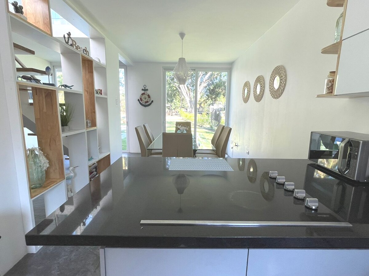 Te estarás hospedando en un hermoso lugar de descanso con jardines llenos de colores y espacios para tu relajación que te permitirán disfrutar del clima característico de una zona costera. Tendrás acceso a la playa a 350 metros de distancia del alojamiento. Te invitamos a visitar una casa acogedora y segura para que tu estadía sea placentera.