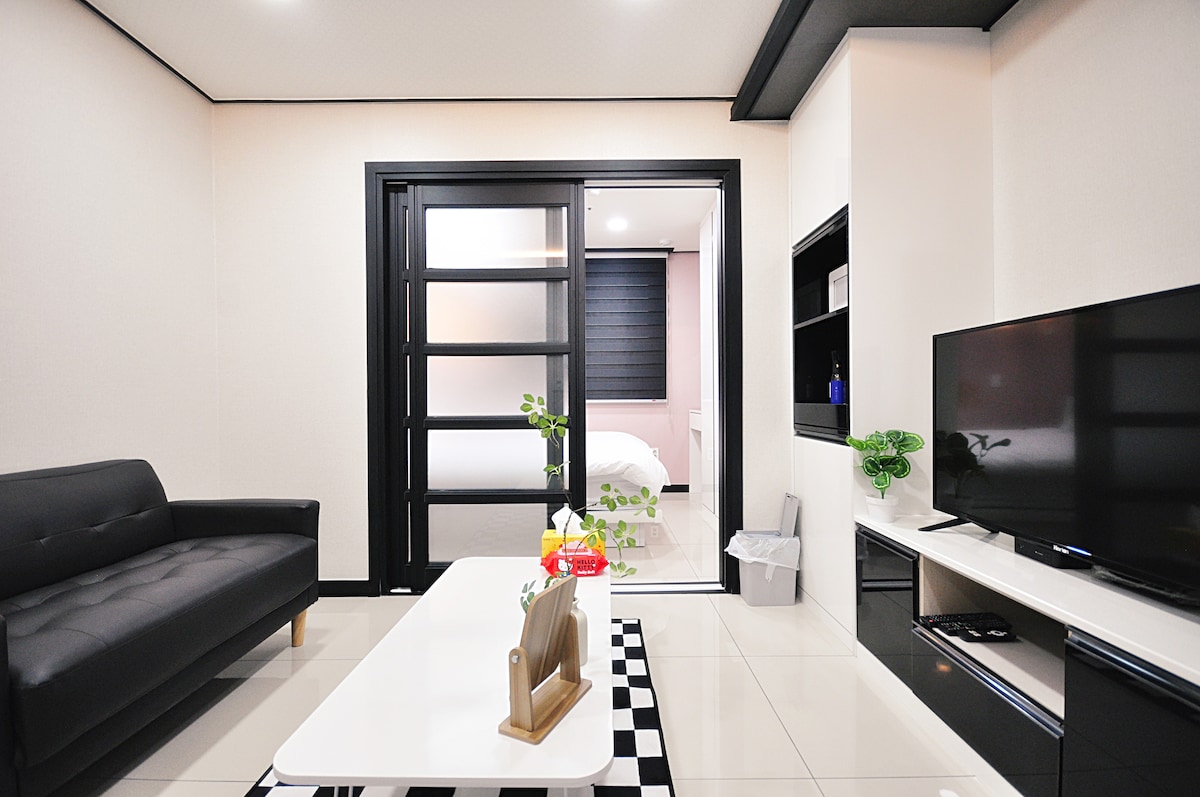 Our Happy Place is a cozy and cozy space with a cozy feeling. It is a 2-minute walk from Pyeongtaek Station, so transportation is easy, and there are many restaurants/cafes nearby, so there are many things to enjoy. It is good for relaxing and dining by dividing the bedroom and dining area, and basic cooking tools, disposable toiletries, towels and dryers are available. I hope you have a comfortable day with your lover and friends. Free parking (may be no space in the parking lot at night)