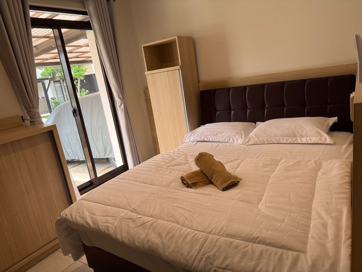 ¡Bienvenido a nuestra acogedora casa que cumple con la Sharia en Kota Baru Parahyangan, Bandung! Nuestra casa ofrece 3 dormitorios con aire acondicionado, 2 baños y una cocina totalmente equipada. Disfruta de televisores inteligentes con Netflix en el dormitorio principal y en la sala de estar. Relájate en la terraza, junto a un parque infantil y una cancha de baloncesto. Estamos cerca de IKEA, Wahoo Waterpark, la zona culinaria de Bumi Hejo y la estación de tren de alta velocidad Woosh. Las familias o parejas deben presentar un certificado de matrimonio o documento de identidad.