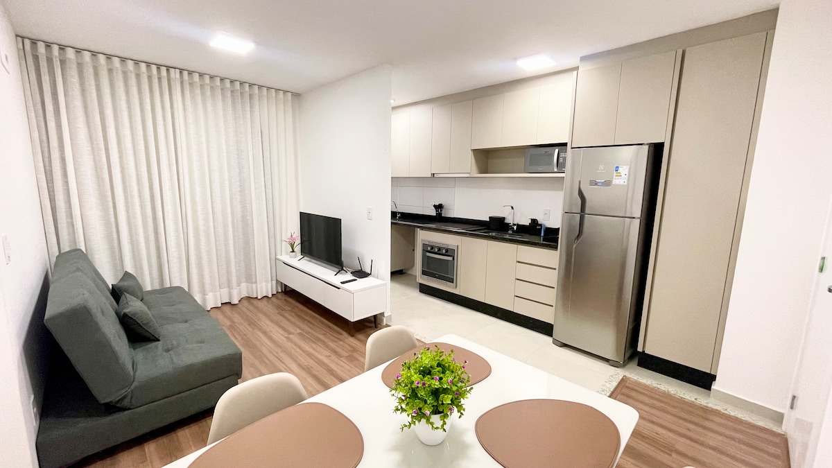 Edificio de alto nivel, excelente ubicación en el centro de la ciudad, gimnasio, piscina y lavandería. El departamento está en el séptimo piso y cuenta con todas las características de accesibilidad y seguridad, con un conserje las 24 horas. Está en el centro de la ciudad, con bares y restaurantes, mercados, farmacia, gasolinera, panadería y bancos cercanos. Apartamento súper completo con todas las características para un gran hospedaje. Duerme hasta 4 personas.