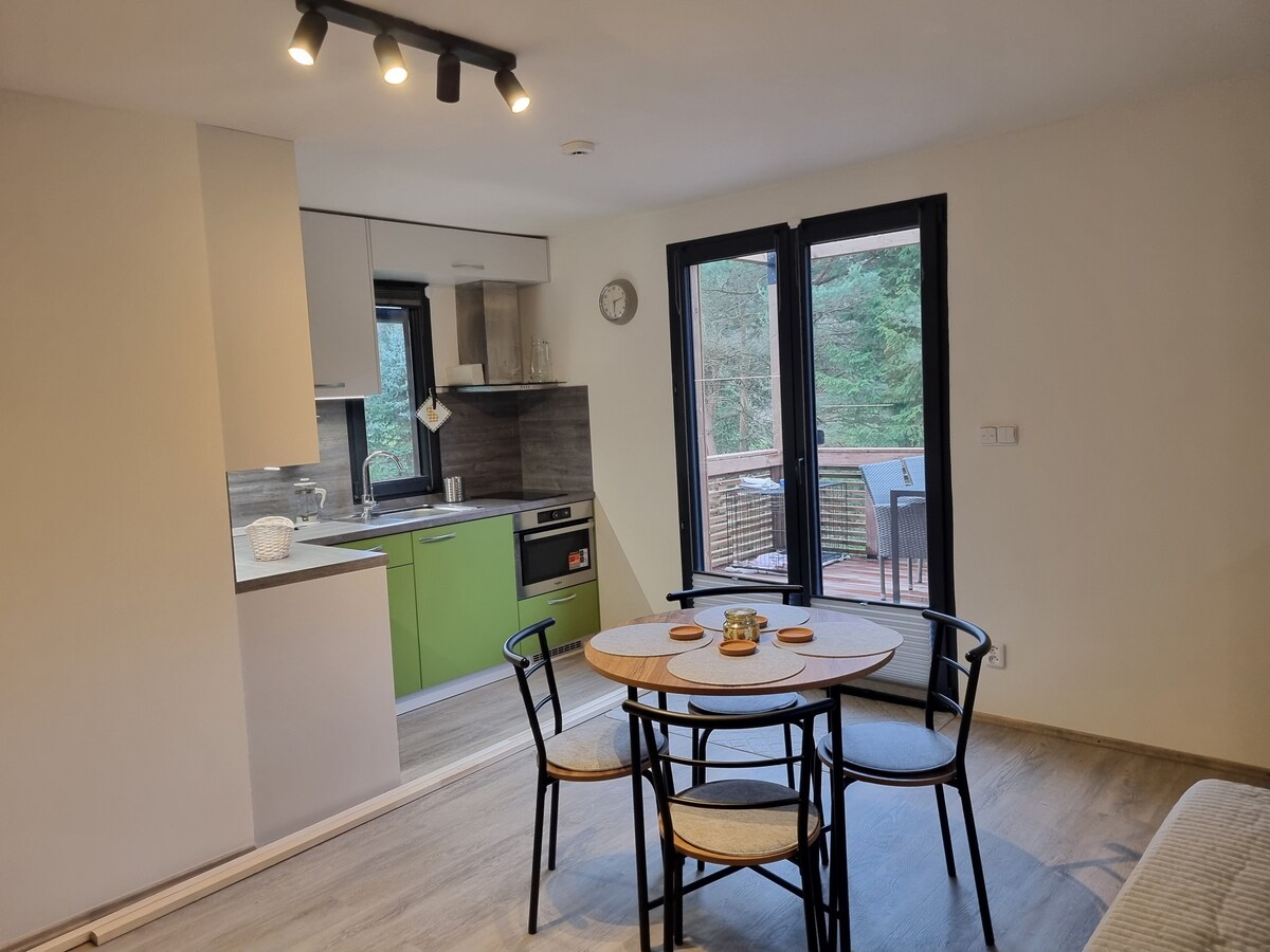 El chalet de nueva construcción en madera se completó con gran atención al detalle en marzo de 2024. Fue construido en un estilo moderno y cumple con los más altos estándares energéticos. El camino desde la plaza de aparcamiento privada, a través de la casa, hasta el porche cubierto con un nuevo jacuzzi eléctrico se ha diseñado a nivel del suelo. En el interior se puede estar cómodo con la estufa de leña y la sauna privada (gratuita). La ruta ciclista del parque nacional y las hermosas rutas de senderismo se encuentran a poca distancia a pie.