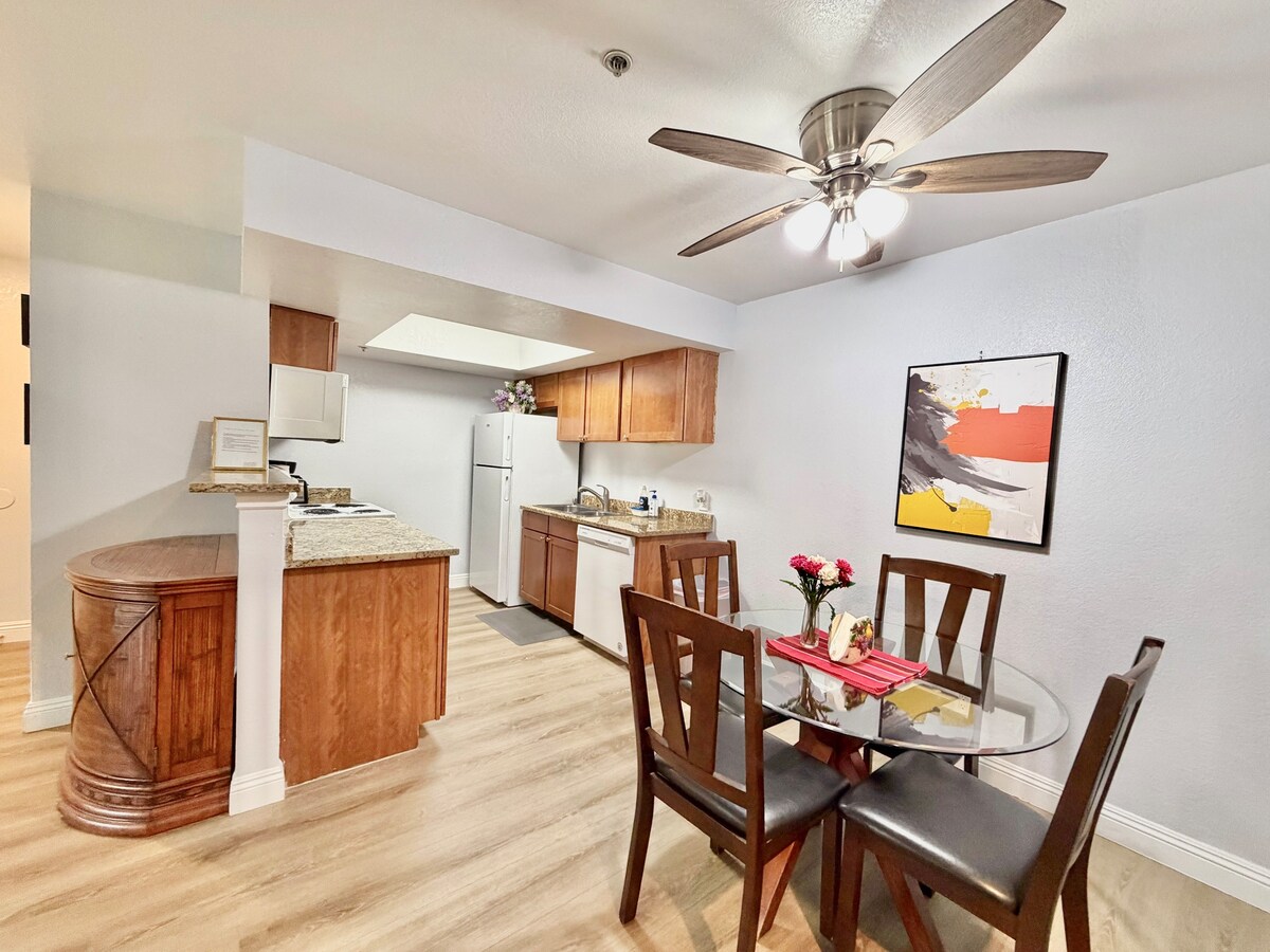 Apartamento remodelado de 1 dormitorio a menos de una milla de Las Vegas Strip en una comunidad segura y vigilada. Disfruta de piscinas, jacuzzis, gimnasio, APARCAMIENTO GRATUITO Y SIN TARIFAS DE RESORT. Interior totalmente remodelado, cocina completa, cafetera Keurig y café. Wifi rápido, Smart TV con Netflix y YouTubeTV para canales locales y deportes, y un cómodo espacio habitable. Perfecto para ocio, conciertos, viajes de negocios y estancias prolongadas.