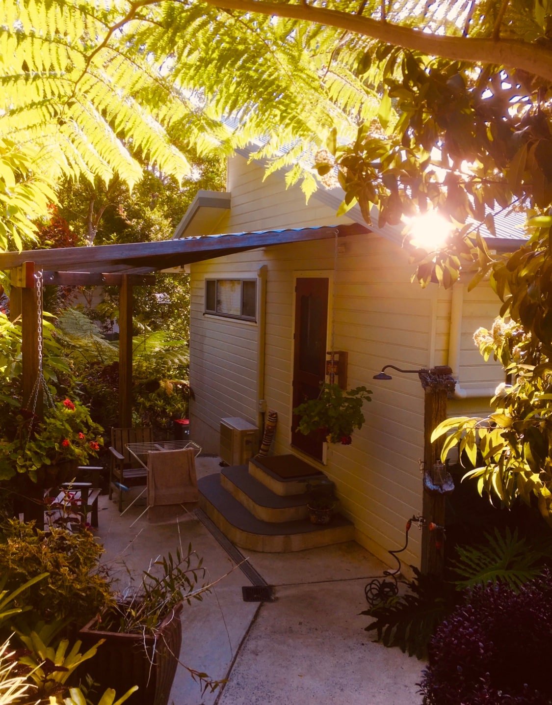Amplio estudio (mi masaje), todo con suelos de madera pulida, luz, fresco y ventilado, con una cocina totalmente equipada. Todos los muebles son modernos. Una extensa cubierta de baldosas de porcelana de 30 pies cuadrados, utilícela para yoga o relajarse en el sofá cama. En lo alto de las copas de los árboles, con vistas a un jardín en terraza bellamente diseñado para capturar el sol de invierno. A 15-20 minutos a pie de la ciudad o de la playa de Tallows, desde el estudio. O a 3 minutos en coche. El estudio tiene su propio módem para una conexión rápida a Internet mediante wifi.
