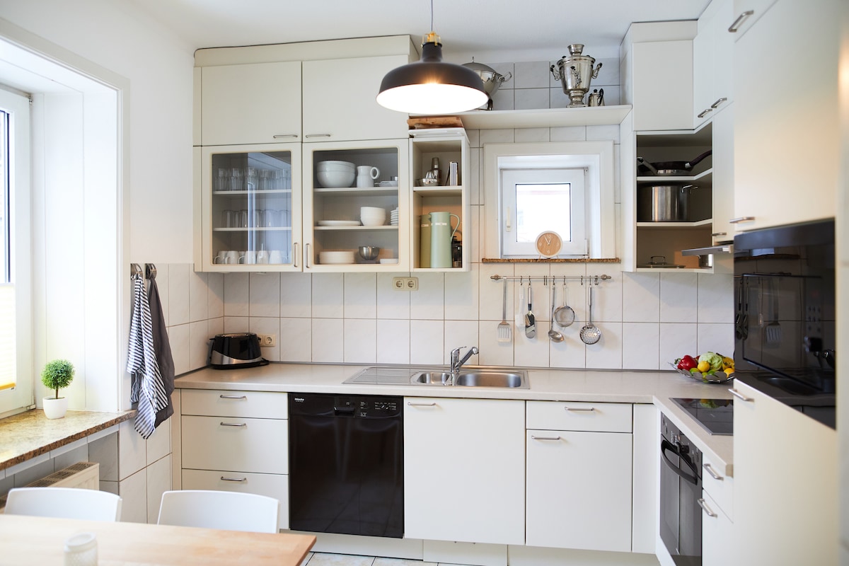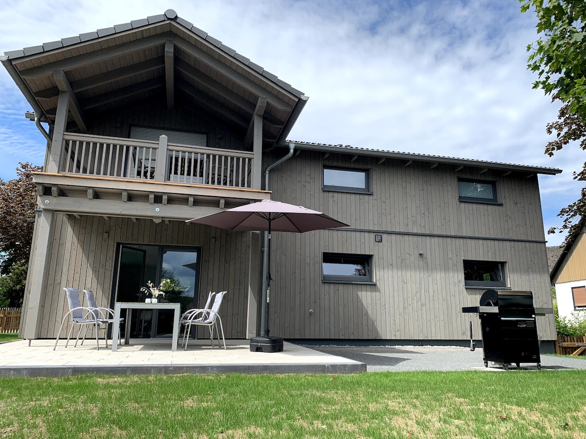 Vergiss deine Sorgen – Dieses ruhige, freistehende Haus lädt mit dem weiten Blick über Felder, Wälder und viel Grün zum Frühstücken auf der Terrasse ein. Perfekt für einen Urlaub oder ein Wochenende zu zweit. Für kalte Tage oder gemütliche Abende steht eine eigene Sauna, ein Whirlpool und ein mit Holz zu befeuernder Kachelofen zur Verfügung. Einkaufsmöglichkeiten sind fußläufig erreichbar, sowie viele schöne Wander- und Waldwege.