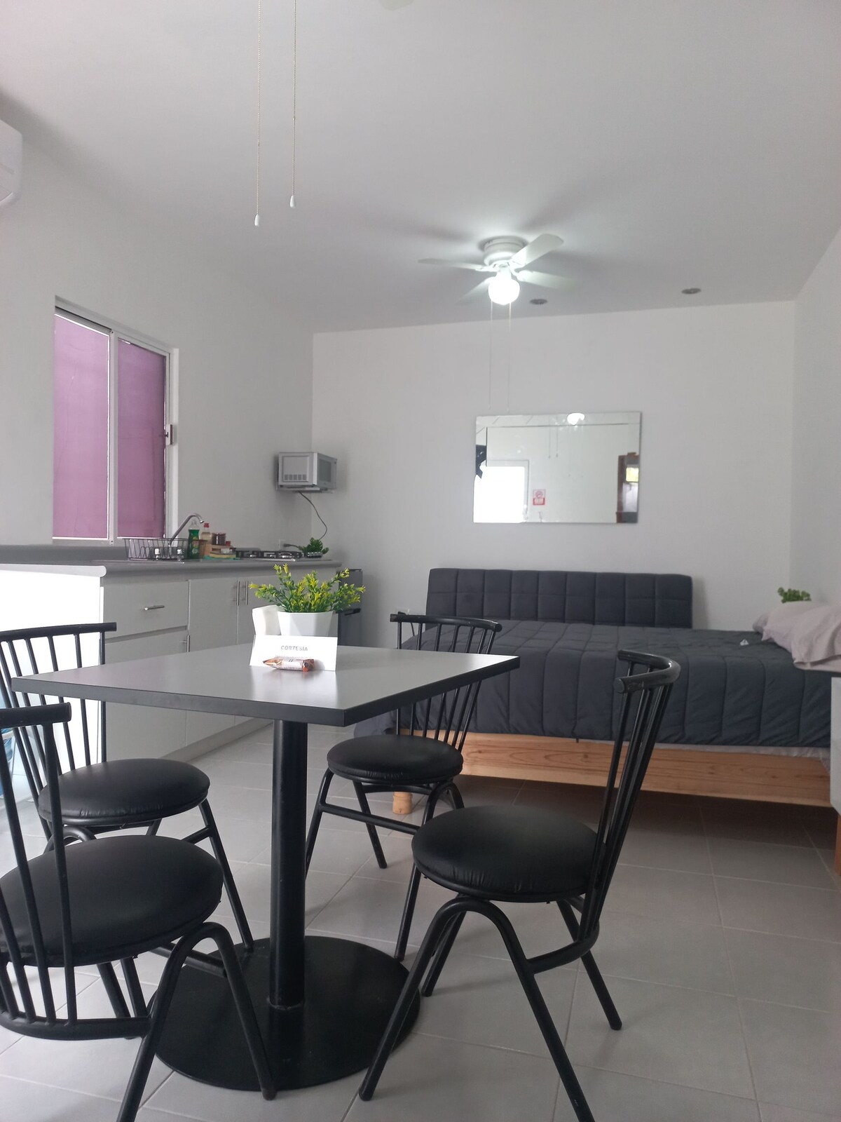 Padrísimo y super cómodo departamento tipo loft con entrada independiente. Está ideado para dos personas pero podría entrar una tercera pues se tiene un sofa cama. Recién remodelado con muebles nuevos! Excelente ubicación, a 1.2 Km del IMSS 16 y de especialidades, a 3 minutos de BLVD de alta afluencia, centros comerciales, restaurantes, etc Tendrás todas las comodidades WIFI, aire acondicionado, TV por cable, agua con fuerte presión y disfrutar de la noche en una bonita terraza.