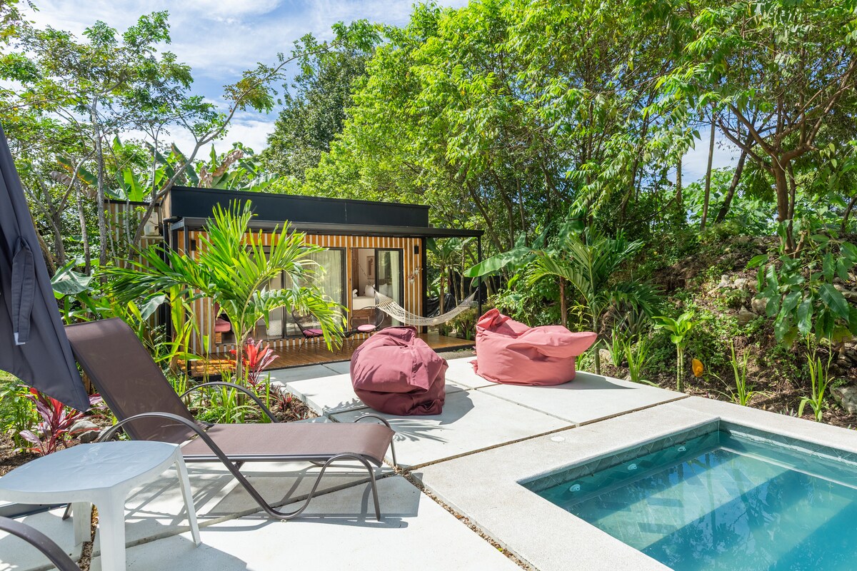 Welcome to Casita El Mañana Escape to your private jungle casita with a sparkling saltwater pool and a bright, newly upgraded outdoor area featuring sunbeds, colourful poufs, and a large umbrella. Surrounded by lush tropical greenery and a covered deck, it’s fully equipped with AC, fast WiFi, and secure parking. The deck and garden are perfect for yoga, meditation, or soaking up the sun. Just 5 minutes from Playa Hermosa and 15–20 minutes from Santa Teresa's beaches- a perfect tropical getaway