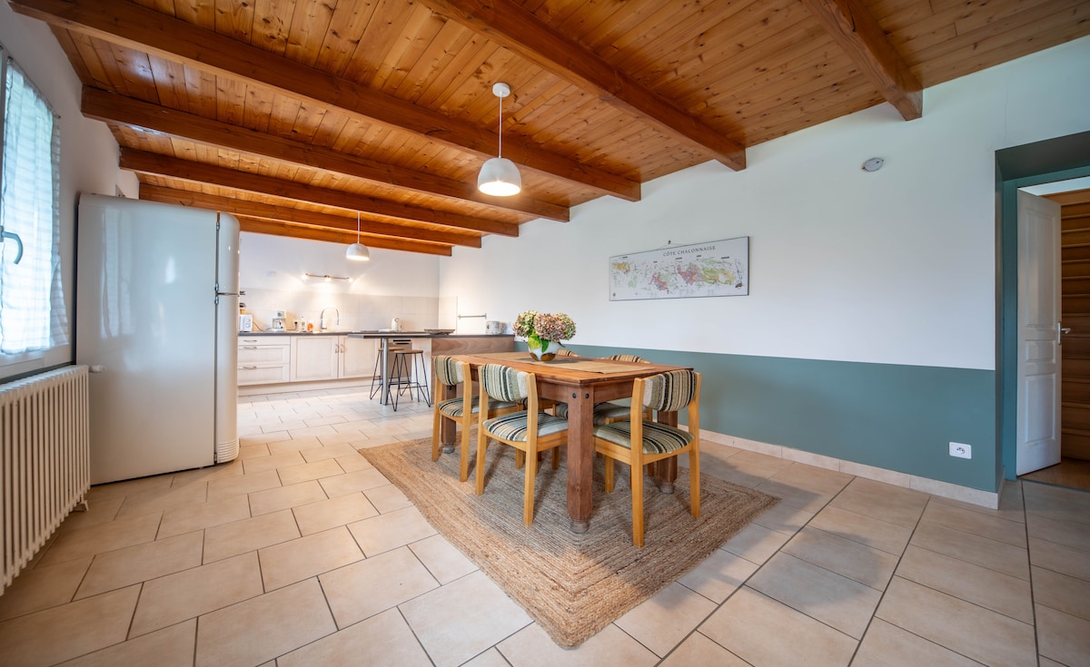 Relájese en este alojamiento tranquilo y elegante. En un entorno magnífico con vistas al Mont Blanc, está cerca de la salida de senderismo y ciclismo de montaña. MOntceau les Mines está a 10 minutos, estación de TGV a 25 minutos, Macon a 40 minutos. El lago de ROUSSET a 10 minutos, el verano del lago en Montceau a 10 minutos. Dispone de un apartamento independiente de 30 m2 ,cocina moderna y todos los elementos de confort de última generación. Cafetera Nespresso y cafetera de filtro. Ropa de cama incluida. Cama de 160.