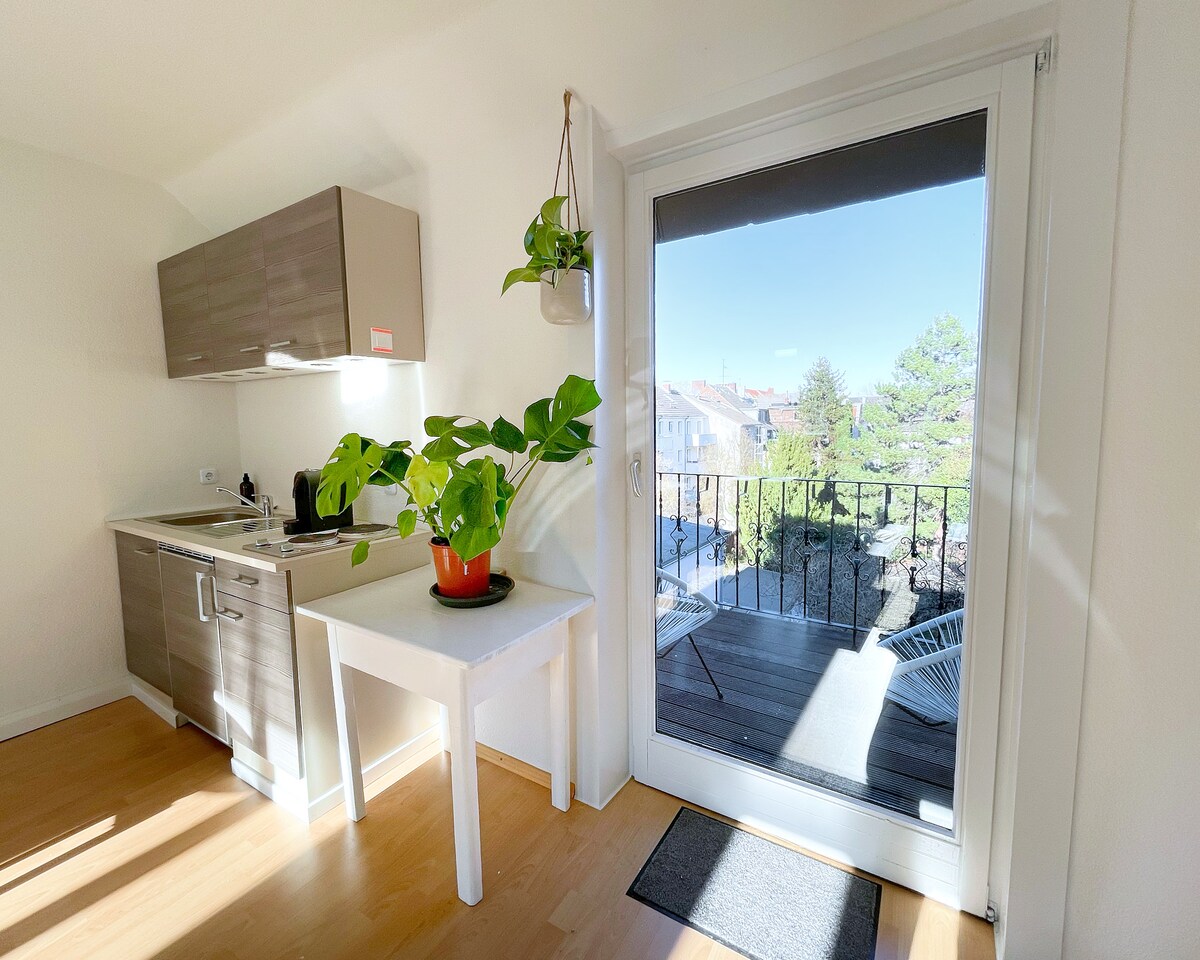 Soleado y exclusivo apartamento de 1 habitación en el centro de Colonia para 1-2 personas; planta abierta, calefacción por suelo radiante, cama cómoda (1,40 x 2 m), elegante sala de estar, cocina, muebles empotrados de alta calidad; diseño de baño moderno con luz natural/mobiliario exclusivo; wifi de alta velocidad de hasta 100 mbit/seg; diseño de iluminación elaborado. A 3 minutos de las calles comerciales, restaurantes y bares en la puerta, a 800 metros de la catedral, autopista A57 en coche en 5 minutos. Reservas de 90 días o más a petición.