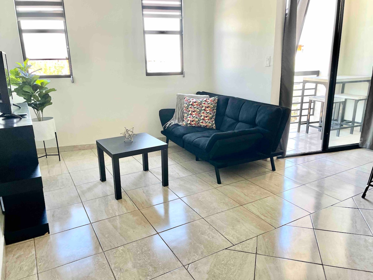 Departamento moderno en area segura ideal para estancias comodas ubicado a corta distancia caminando de bancos restaurantes gimnasio y zona hotelera perfecto para viajeros de negocio o descanso cuenta con espacios funcionales iluminacion agradable y ambiente tranquilo estacionamiento disponible sobre la acera cercano a todos los servicios necesarios para una experiencia practica accesible y confortable en la ciudad. Ubicado en segundo piso.