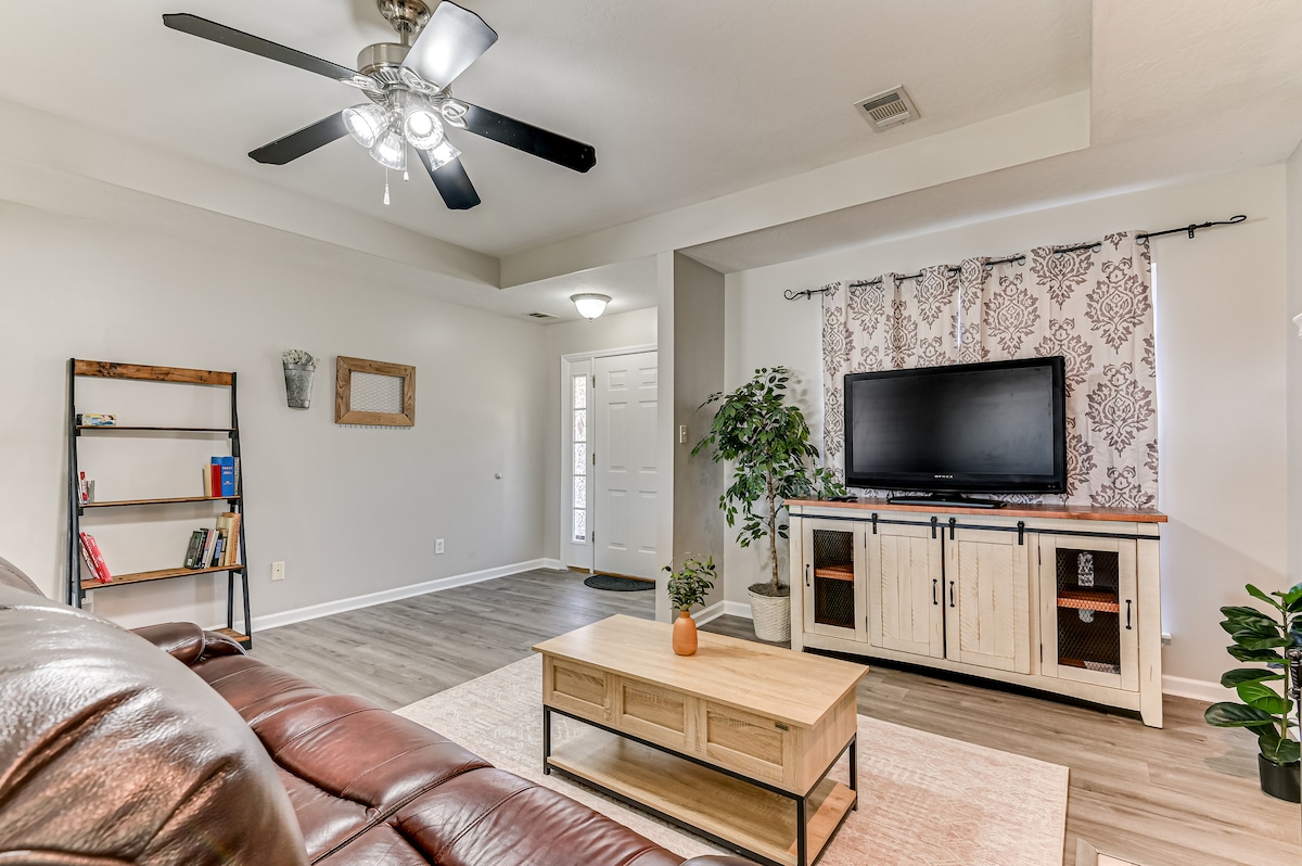 This stylish and charming home is the perfect retreat. 7 minutes away from the Augusta Mall and 12 from the Master’s. Several restaurants nearby, you’ll find plenty of dining options. Inside, you’ll find a beautifully decorated space with thoughtful amenities to make your stay comfortable. The fully loaded kitchen is perfect for preparing meals and includes a DIY waffle station and coffee bar—a delightful way to start your day. The stylish living areas offer a cozy, welcoming place to unwind.