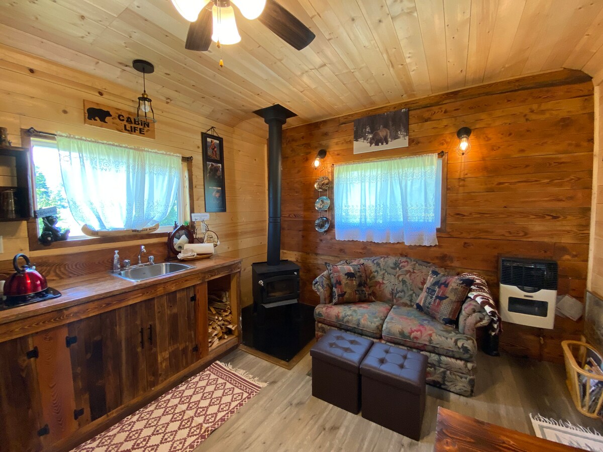Una pintoresca cabaña privada hecha a mano en el bosque con vistas a un arroyo y pastos de búfalos rodeados de majestuosas vistas de las Rocosas canadienses. Tiene un inodoro adjunto muy limpio. Esta cabaña está fuera de la red, luz de velas, zona de cocina exterior e interior, estufa de leña y calefacción de propano, romántica y acogedora, chimenea privada, ¡con estatus de Superanfitrión! Hay 4 alquileres privados más también en el rancho en Airbnb, todos empezando por Buffalo Ranch: casa de huéspedes/cabaña con sauna/vagón en el bosque/barraca.