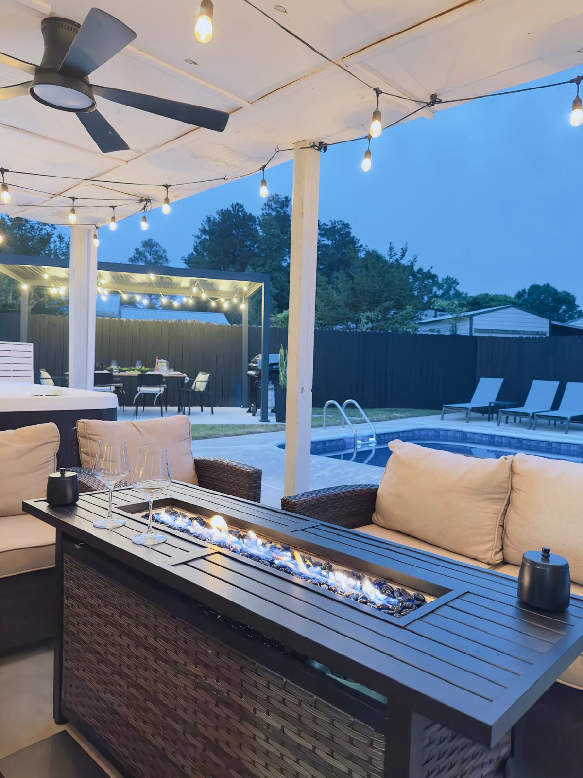 Experience a resort-style stay for connection with our two-storey 3000sf pool retreat in quiet & safe North Columbus neighborhood. 8mins from shopping, dining, theater, Chattahoochee River, ~15mins from downtown, FT Benning. Ideal for families & group stays visiting Fort Benning. • Hot tub • Pool (non heated) • Theater Room • Pool Table • Nintendo Switch • Foosball • Arcade • Axe Throwing+Giant Connect4 • Dart Board • BBQ, Pizza oven • Patio dining • Patio Lounging w/Firepit • 5 Smart TV