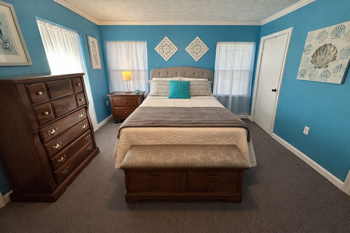 Tu familia estará cerca de todo cuando te hospedes en nuestra casa céntrica; cerca de todo, pero lejos del bullicio de la ciudad. Ven a pasar un buen rato con tus amigos y familiares en nuestra pequeña y pintoresca casa con un gran porche delantero para charlar y un porche trasero cubierto para visitar. La casa está totalmente equipada para una estancia larga o una visita corta. Tenemos todo lo que necesitas para cocinar o simplemente tomar una taza de café recién hecho de nuestros amigos de Fountain City Coffee.